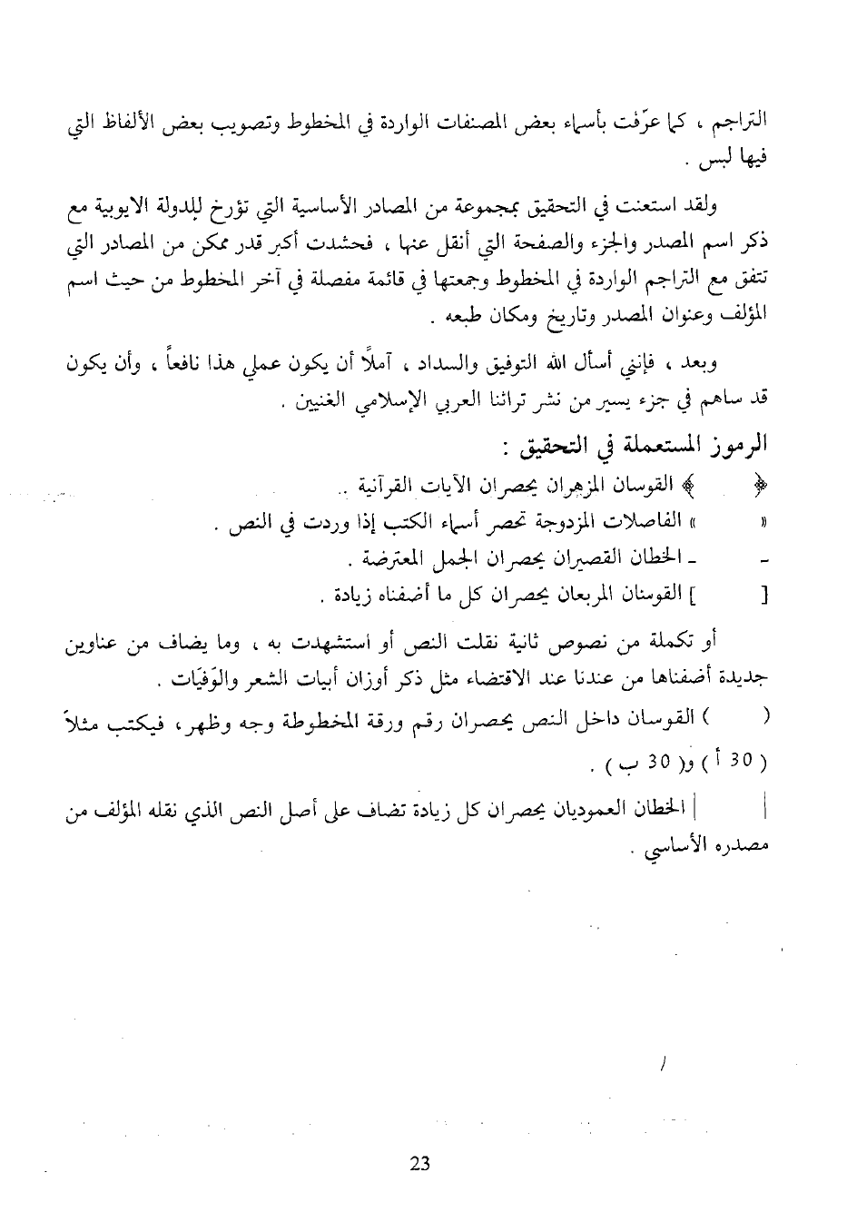 () القوسان داخل النص يحصران رقم ورقة المخطوطة وجه وظهر، فيكتب مثلا (30 أ) و (30 ب).