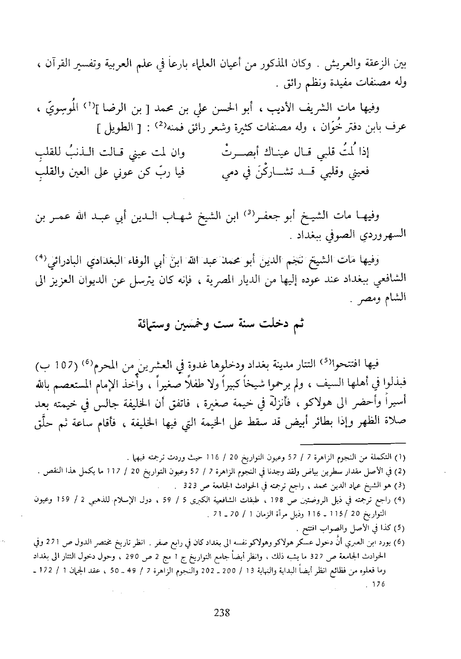 (¬6) يورد ابن العبري أنّ دخول عسكر هولاكو وهولاكو نفسه الى بغداد كان في رابع صفر. انظر تاريخ مختصر الدول ص 271 وفي الحوادث الجامعة ص 327 ما يشبه ذلك، وانظر أيضا جامع التواريخ ج 1 مج 2 ص 290، وحول دخول التتار الى بغداد وما فعلوه من فظائع انظر أيضا البداية والنهاية 13/ 200 - 202 والنجوم الزاهرة 7/ 49 - 50، عقد الجمان 1/ 172 - 176.