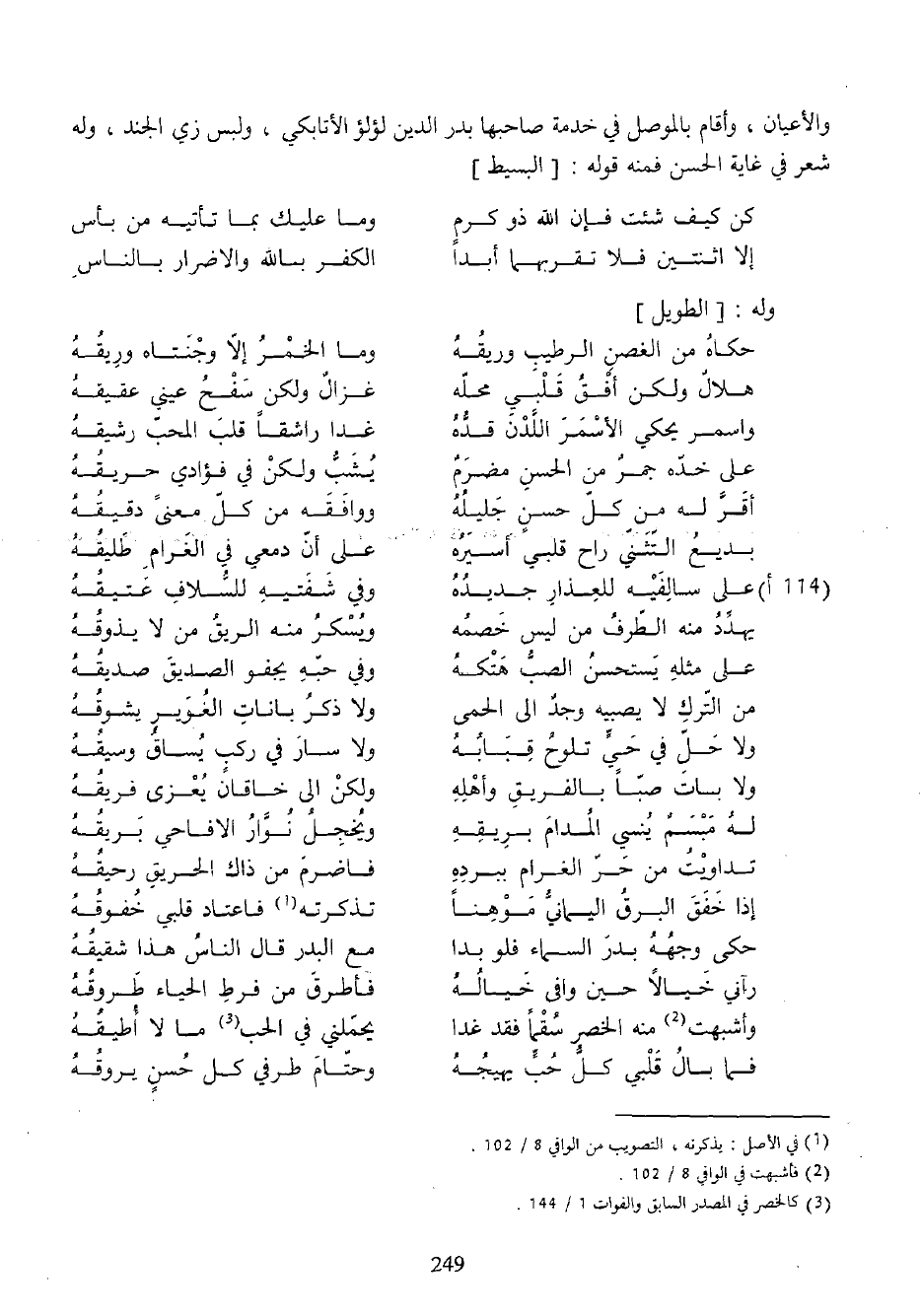 والأعيان، وأقام بالموصل في خدمة صاحبها بدر الدين لؤلؤ الأتابكي، ولبس زي الجند، وله شعر في غاية الحسن فمنه قوله: [البسيط]