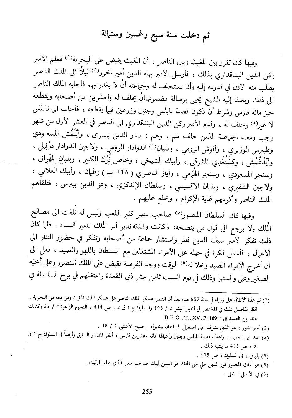 (¬1) تم هذا الاتفاق على زيزاء في سنة 657 هـ وبعد أن انتصر عسكر الملك الناصر على عسكر الملك المغيث ومن معه من البحرية. انظر تفاصيل ذلك في المختصر في أخبار البشر 3/ 198 والسلوك ج 1 ق 2، ص 414، النجوم الزاهرة 7/ 53 وكذلك عند ابن العميد في:
