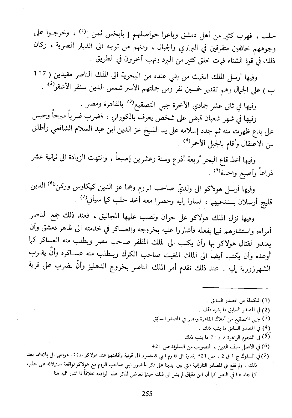 (¬7) في السلوك ج 1 ق 2، ص 421 إشارة الى قدوم ابني كيخسرو الى قونية وأقامتهما عند هولاكو مدة ثم عودتهما الى بلادهما بعد ذلك، ولم نقع في المصادر التاريخية التي بين ايدينا على ذكر لحضور ابني صاحب الروم مع هولاكو لواقعة استيلائه على حلب كما جاء هنا في النص كما أن ابن دقماق لم يشر الى ذلك حينما تعرض لذكر هذه الواقعة خلافا لما أشار اليه هنا.