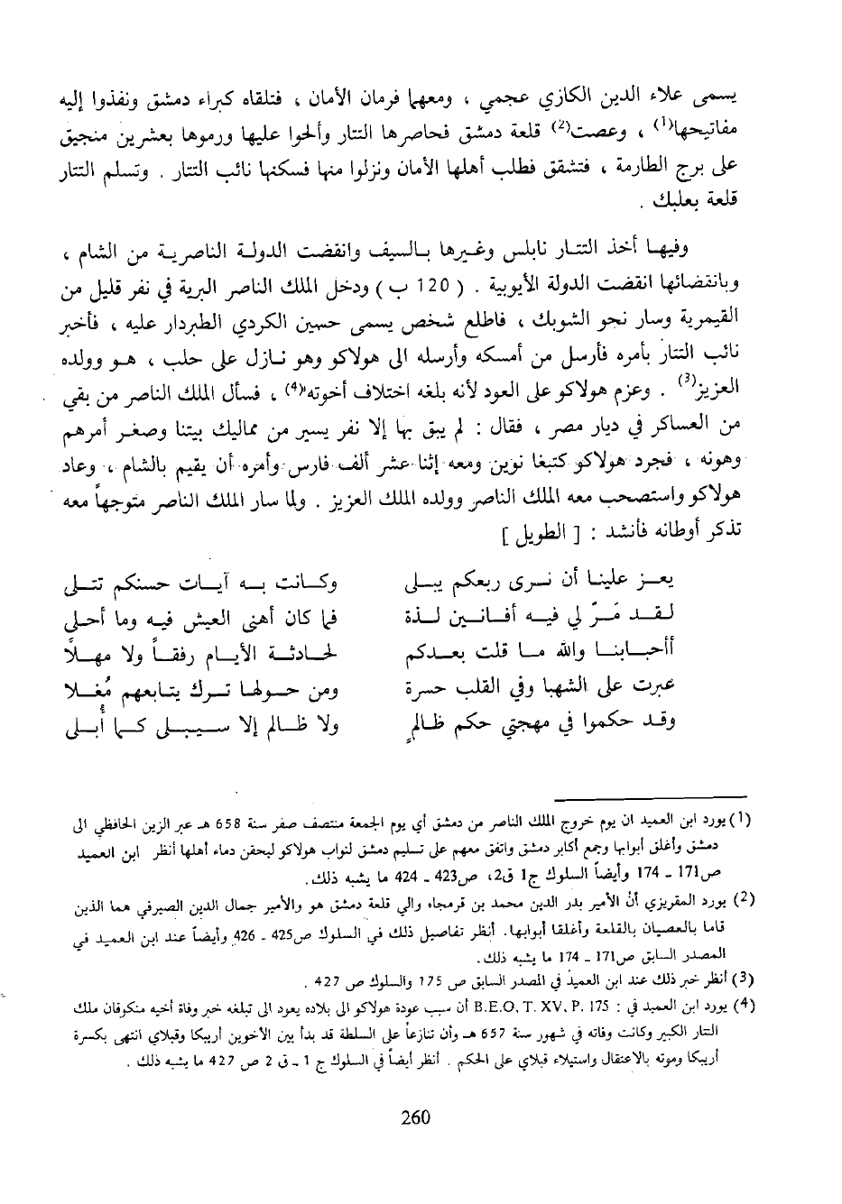 (¬1) يورد ابن العميد ان يوم خروج الملك الناصر من دمشق أي يوم الجمعة منتصف صفر سنة 658 هـ عبر الزين الحافظي الى دمشق وأغلق أبوابها وجمع أكابر دمشق واتفق معهم على تسليم دمشق لنواب هولاكو ليحقن دماء أهلها أنظر ابن العميد ص 171 - 174 وأيضا السلوك ج 1 ق 2، ص 423 - 424 ما يشبه ذلك.