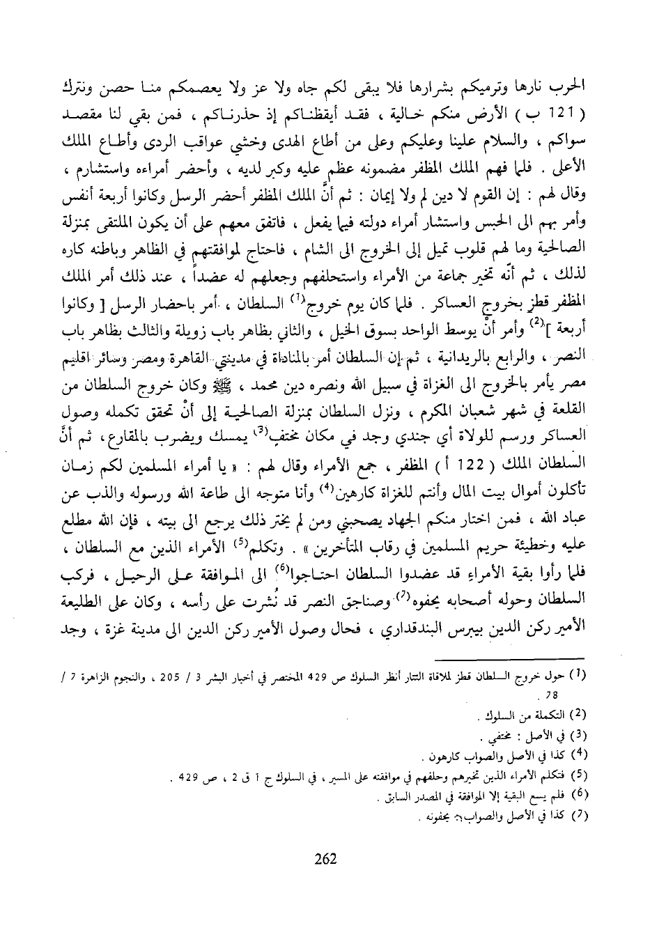 الحرب نارها وترميكم بشرارها فلا يبقى لكم جاه ولا عز ولا يعصمكم منا حصن ونترك (121 ب) الأرض منكم خالية، فقد أيقظناكم إذ حذرناكم، فمن بقي لنا مقصد سواكم، والسلام علينا وعليكم وعلى من أطاع الهدى وخشي عواقب الردى وأطاع الملك الأعلى. فلما فهم الملك المظفر مضمونه عظم عليه وكبر لديه، وأحضر أمراءه واستشارم، وقال لهم: إن القوم لا دين لم ولا إيمان: ثم أنّ الملك المظفر أحضر الرسل وكانوا أربعة أنفس وأمر بهم الى الحبس واستشار أمراء دولته فيما يفعل، فاتفق معهم على أن يكون الملتقى بمنزلة الصالحية وما لهم قلوب تميل إلى الخروج الى الشام، فاحتاج لموافقتهم في الظاهر وباطنه كاره لذلك، ثم أنّه تخير جماعة من الأمراء واستحلفهم وجعلهم له عضدا، عند ذلك أمر الملك المظفر قطز بخروج العساكر. فلما كان يوم خروج (¬1) السلطان، أمر باحضار الرسل [وكانوا أربعة] (¬2) وأمر أن يوسط الواحد بسوق الخيل، والثاني بظاهر باب زويلة والثالث بظاهر باب النصر، والرابع بالريدانية، ثم إن السلطان أمر بالمناداة في مدينتي القاهرة ومصر وسائر اقليم مصر يأمر بالخروج الى الغزاة في سبيل الله ونصره دين محمد، صلّى الله عليه وسلّم وكان خروج السلطان من القلعة في شهر شعبان المكرم، ونزل السلطان بمنزلة الصالحية إلى أن تحقق تكمله وصول العساكر ورسم للولاة أي جندي وجد في مكان مختف (¬3) يمسك ويضرب بالمقارع، ثم أنّ السلطان الملك (122 أ) المظفر، جمع الأمراء وقال لهم: «يا أمراء المسلمين لكم زمان تأكلون أموال بيت المال وأنتم للغزاة كارهين (¬4) وأنا متوجه الى طاعة الله ورسوله والذب عن عباد الله، فمن اختار منكم الجهاد يصحبني ومن لم يختر ذلك يرجع الى بيته، فإن الله مطلع عليه وخطيئة حريم المسلمين في رقاب المتأخرين». وتكلم (¬5) الأمراء الذين مع السلطان، فلما رأوا بقية الأمراء قد عضدوا السلطان احتاجوا (¬6) الى الموافقة على الرحيل، فركب السلطان وحوله أصحابه يحفوه (¬7) وصناجق النصر قد نشرت على رأسه، وكان على الطليعة الأمير ركن الدين بيبرس البندقداري، فحال وصول الأمير ركن الدين الى مدينة غزة، وجد