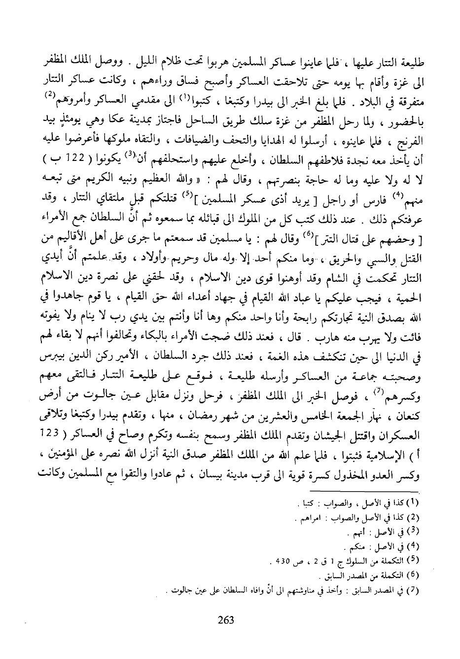 طليعة التتار عليها، فلما عاينوا عساكر المسلمين هربوا تحت ظلام الليل. ووصل الملك المظفر الى غزة وأقام بها يومه حتى تلاحقت العساكر وأصبح فساق وراءهم، وكانت عساكر التتار متفرقة في البلاد. فلما بلغ الخبر الى بيدرا وكتبغا، كتبوا (¬1) الى مقدمي العساكر وأمروهم (¬2) بالحضور، ولما رحل المظفر من غزة سلك طريق الساحل فاجتاز بمدينة عكا وهي يومئذ بيد الفرنج، فلما عاينوه، أرسلوا له الهدايا والتحف والضيافات، والتقاه ملوكها فأعرضوا عليه أن يأخذ معه نجدة فلاطفهم السلطان، وأخلع عليهم واستحلفهم أن (¬3) يكونوا (122 ب) لا له ولا عليه وما له حاجة بنصرتهم، وقال لهم: «والله العظيم ونبيه الكريم متى تبعه منهم (¬4) فارس أو راجل [يريد أذى عسكر المسلمين] (¬5) قتلتكم قبل ملتقاي التتار، وقد عرفتكم ذلك. عند ذلك كتب كل من الملوك الى قبائله بما سمعوه ثم أنّ السلطان جمع الأمراء [وحضهم على قتال التتر] (¬6) وقال لهم: يا مسلمين قد سمعتم ما جرى على أهل الأقاليم من القتل والسبي والحريق، وما منكم أحد إلا وله مال وحريم وأولاد، وقد علمتم أنّ أيدي التتار تحكمت في الشام وقد أوهنوا قوى دين الاسلام، وقد لحقني على نصرة دين الاسلام الحمية، فيجب عليكم يا عباد الله القيام في جهاد أعداء الله حق القيام، يا قوم جاهدوا في الله بصدق النية تجارتكم رابحة وأنا واحد منكم وها أنا وأنتم بين يدي رب لا ينام ولا يفوته فائت ولا يهرب منه هارب. قال، فعند ذلك ضجت الأمراء بالبكاء وتحالفوا أنهم لا بقاء لهم في الدنيا الى حين تنكشف هذه الغمة، فعند ذلك جرد السلطان، الأمير ركن الدين بيبرس وصحبته جماعة من العساكر وأرسله طليعة، فوقع على طليعة التتار فالتقى معهم وكسرهم (¬7)، فوصل الخبر الى الملك المظفر، فرحل ونزل مقابل عين جالوت من أرض كنعان، نهار الجمعة الخامس والعشرين من شهر رمضان، منها، وتقدم بيدرا وكتبغا وتلاقى العسكران واقتتل الجيشان وتقدم الملك المظفر وسمح بنفسه وتكرم وصاح في العساكر (123 أ) الإسلامية فثبتوا، فلما علم الله من الملك المظفر صدق النية أنزل الله نصره على المؤمنين، وكسر العدو المخذول كسرة قوية الى قرب مدينة بيسان، ثم عادوا والتقوا مع المسلمين وكانت