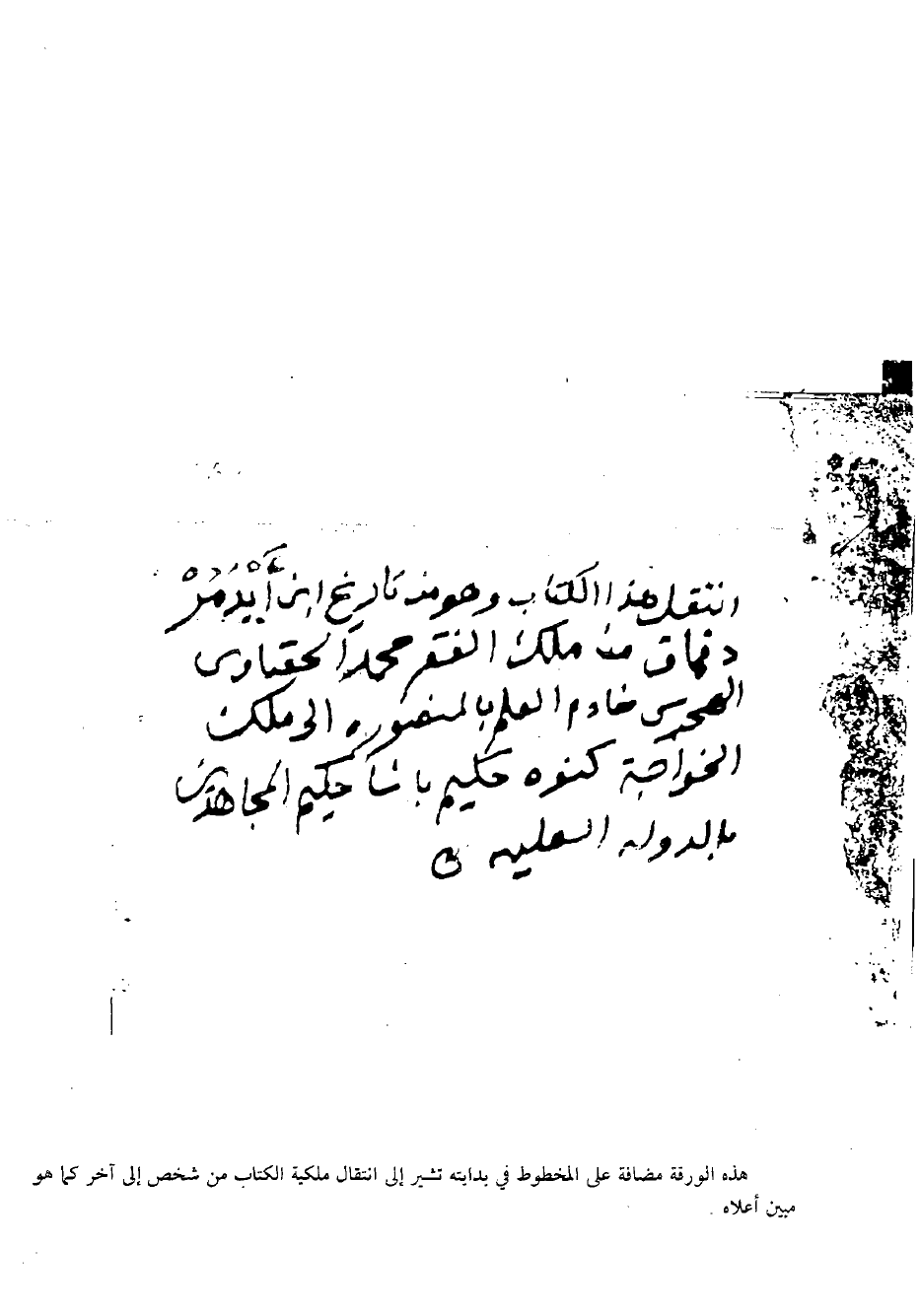 هذه الورقة مضافة على المخطوط في بدايته تشير إلى انتقال ملكية الكتاب من شخص إلى آخر كما هو مبين أعلاه.