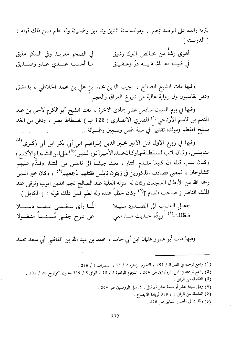 (¬2) راجع ترجمته في ذيل الروضتين ص 204، النجوم الزاهرة 7/ 93، الوافي 5/ 339 وعيون التواريخ 20/ 232.