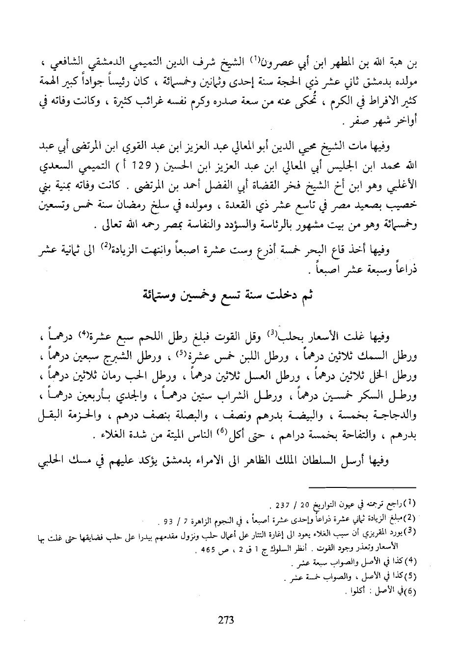 (¬3) يورد المقريزي أن سبب الغلاء يعود الى إغارة التتار على أعمال حلب ونزول مقدمهم بيدرا على حلب فضايقها حتى غلت بها الأسعار وتعذر وجود القوت. أنظر السلوك ج 1 ق 2، ص 465.