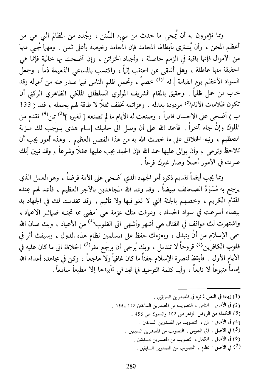 ومما يجب أيضا تقديم ذكره أمر الجهاد الذي أضحى على الأمة فرضا، وهو العمل الذي يرجع به مسودّ الصحائف مبيضا. وقد وعد الله المجاهدين بالأجر العظيم، فأعد لهم عنده المقام الكريم، وخصهم بالجنة التي لا لغو فيها ولا تأثيم، وقد تقدمت لك في الجهاد يد بيضاء أسرعت في سواد الحساد، وعرفت منك عزمة هي أمضى مما تجنه ضمائر الاغماد، واشتهرت لك مواقف في القتال هي أشهر وأشهى الى القلوب (¬5) من الأعياد، وبك صان الله حمى الإسلام من أن يتبدل، وبعزمك حفظ على المسلمين نظام هذه الدول، وسيفك أثر في قلوب الكافرين (¬6) قروحا لا تندمل، وبك يرجى أن يرجع مقر (¬7) الخلافة الى ما كان عليه في الأيام الأول. فأيقظ لنصرة الإسلام جفنا ما كان غافيا ولا هاجعا، وكن في مجاهدة أعداء الله إماما متبوعا لا تابعا، وأيد كلمة التوحيد فما تجد في تأييدها إلا مطيعا سامعا.