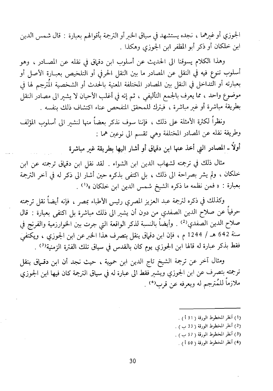 الجوزي أو غيرهما، نجده يستشهد في سياق الخبر أو الترجمة بأقوالهم بعبارة: قال شمس الدين ابن خلكان أو ذكر أبو المظفر ابن الجوزي وهكذا.