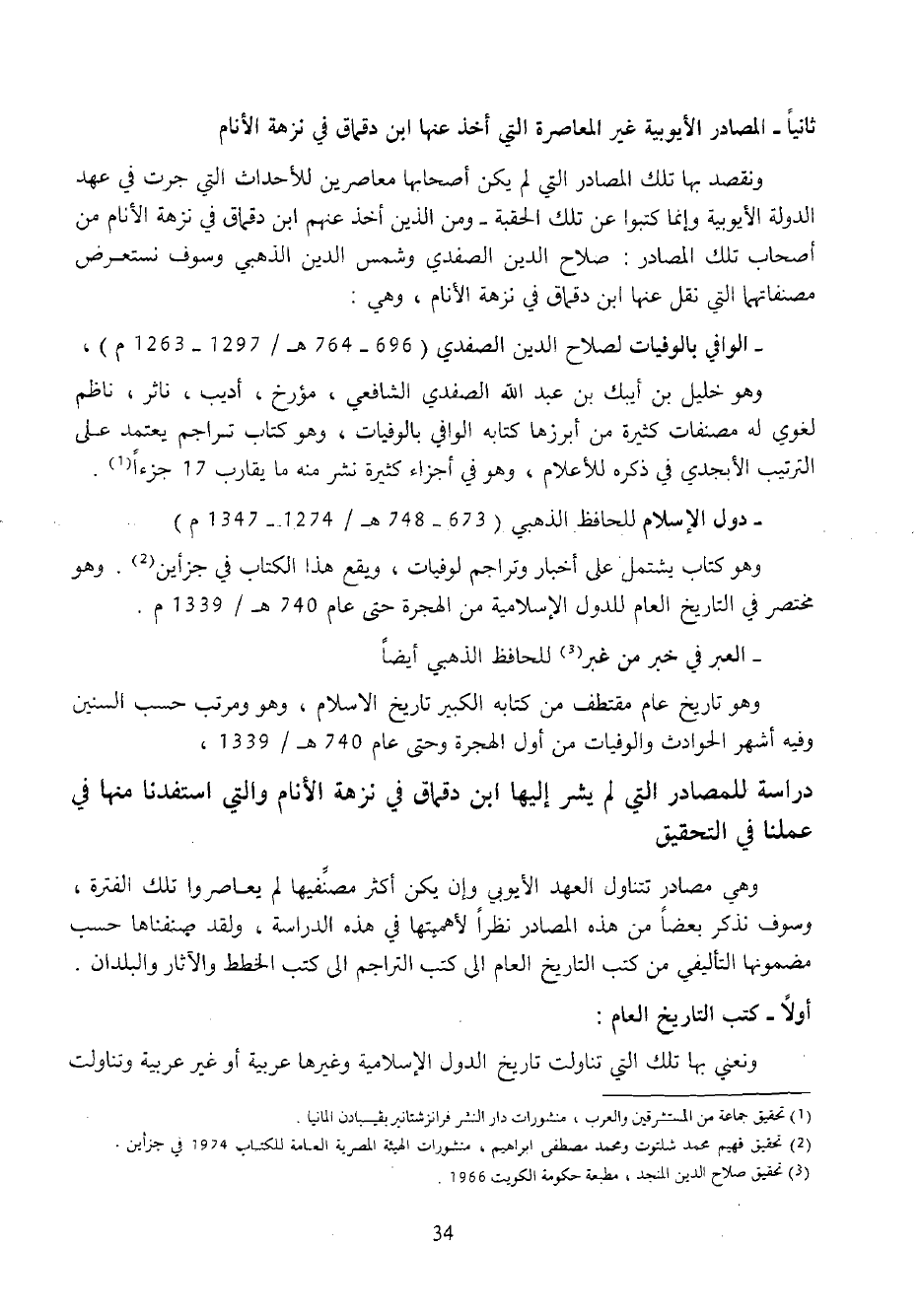 ونقصد بها تلك المصادر التي لم يكن أصحابها معاصرين للأحداث التي جرت في عهد الدولة الأيوبية وإنما كتبوا عن تلك الحقبة - ومن الذين أخذ عنهم ابن دقماق في نزهة الأنام من أصحاب تلك المصادر: صلاح الدين الصفدي وشمس الدين الذهبي وسوف نستعرض مصنفاتهما التي نقل عنها ابن دقماق في نزهة الأنام، وهي: