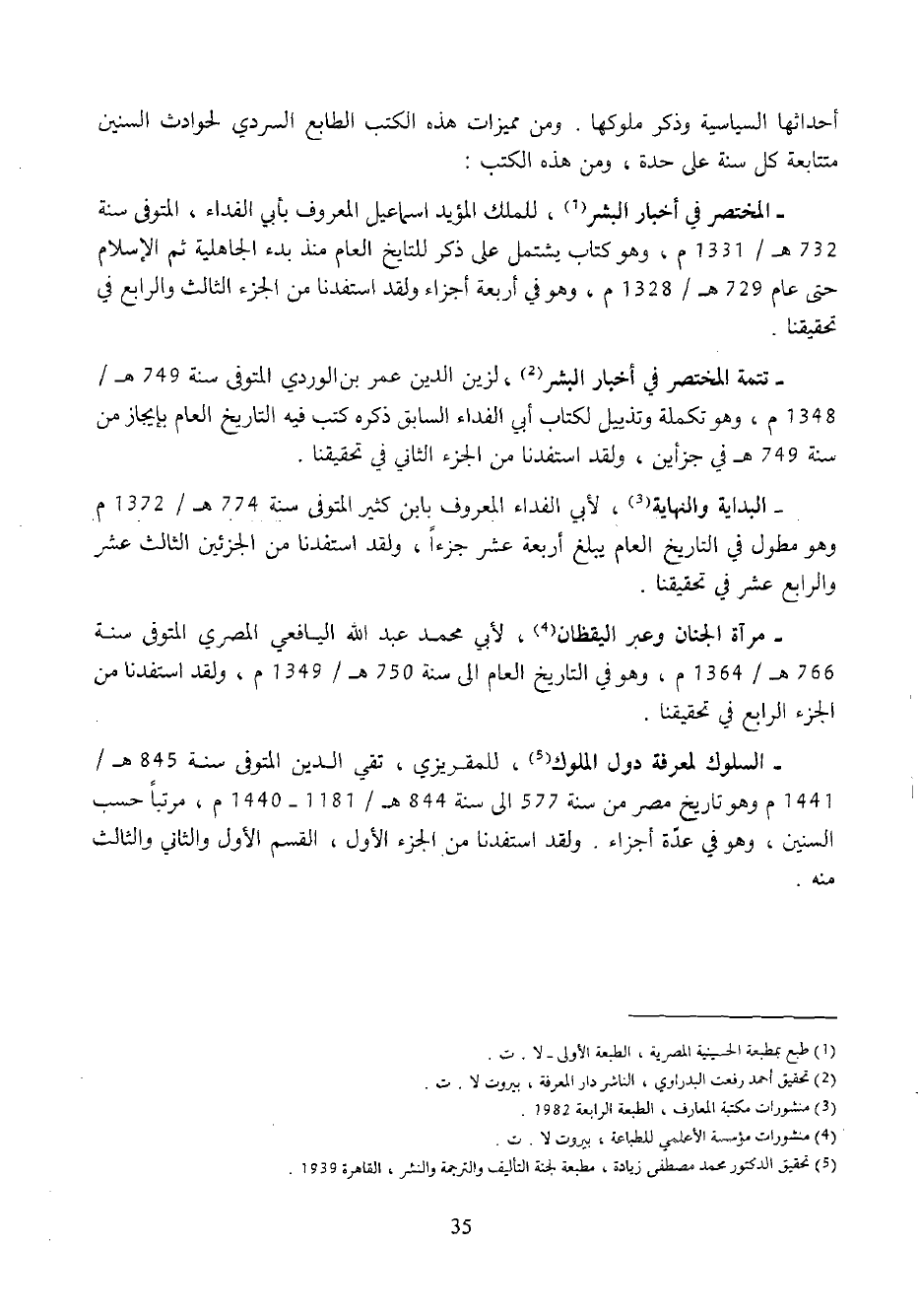 - المختصر في أخبار البشر (¬1)، للملك المؤيد اسماعيل المعروف بأبي الفداء، المتوفى سنة 732 هـ / 1331 م، وهو كتاب يشتمل على ذكر للتاريخ العام منذ بدء الجاهلية ثم الإسلام حتى عام 729 هـ / 1328 م، وهو في أربعة أجزاء ولقد استفدنا من الجزء الثالث والرابع في تحقيقنا.