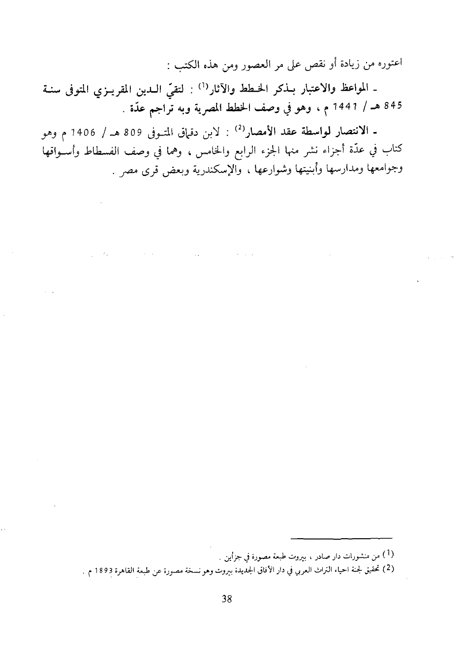 - الانتصار لواسطة عقد الأمصار (¬2): لابن دقماق المتوفى 809 هـ / 1406 م وهو كتاب في عدّة أجزاء نشر منها الجزء الرابع والخامس، وهما في وصف الفسطاط وأسواقها وجوامعها ومدارسها وأبنيتها وشوارعها، والإسكندرية وبعض قرى مصر.