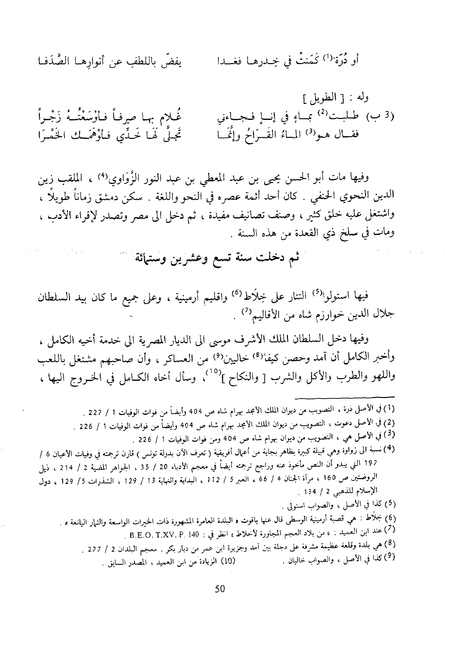 وفيها مات أبو الحسن يحيى بن عبد المعطي بن عبد النور الزّواوي (¬4)، الملقب زين الدين النحوي الحنفي. كان أحد أئمة عصره في النحو واللغة. سكن دمشق زمانا طويلا، واشتغل عليه خلق كثير، وصنف تصانيف مفيدة، ثم دخل الى مصر وتصدر لإقراء الأدب، ومات في سلخ ذي القعدة من هذه السنة.