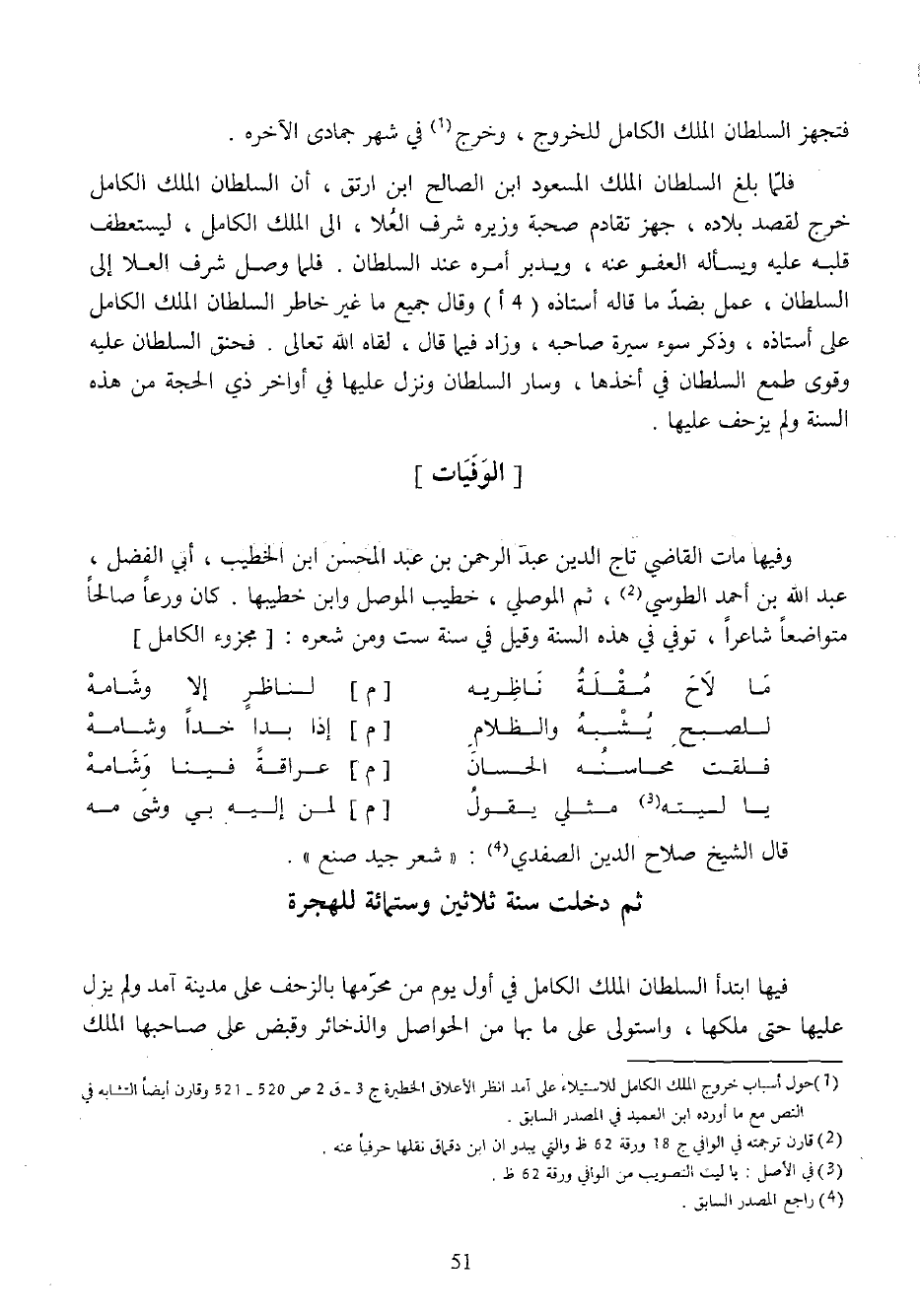 (¬1) حول أسباب خروج الملك الكامل للاستيلاء على آمد انظر الأعلاق الخطيرة ج 3 - ق 2 ص 520 - 521 وقارن أيضا التشابه في النص مع ما أورده ابن العميد في المصدر السابق.