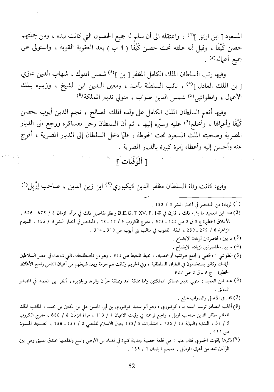 (¬8) أغلب المصادر ترسم اسمه ب «كوكبوري» وهو أبو سعيد كوكبوري بن أبي الحسن علي بن بكتين بن محمد، الملقب الملك المعظم مظفر الدين صاحب اربل، راجع ترجمته في وفيات الأعيان 4/ 113، مرآة الزمان 8/ 680، مفرج الكروب 5/ 51، البداية والنهاية 13/ 136، الشذرات 5/ 138 ودول الاسلام للذهبي 2/ 135 - 136، العسجد المسبوك ص 452.