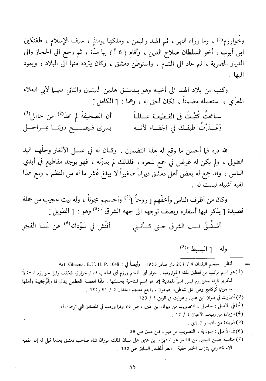 (¬7) مناسبة هذين البيتين من الشعر هو استهزاء ابن عنين على لسان الملك توران شاه صاحب دمشق بعدما قيل له إن الفقيه الاسكندراني يشرب الخمر خفية. انظر المصدر السابق ص 132.