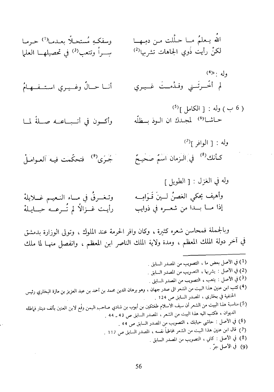 (¬4) كتب ابن عنين هذا البيت من الشعر الى صدر جهان، وهو برهان الدين محمد بن أحمد بن عبد العزيز بن مازة البخاري رئيس الحنفية في بخارى، المصدر السابق ص 124.