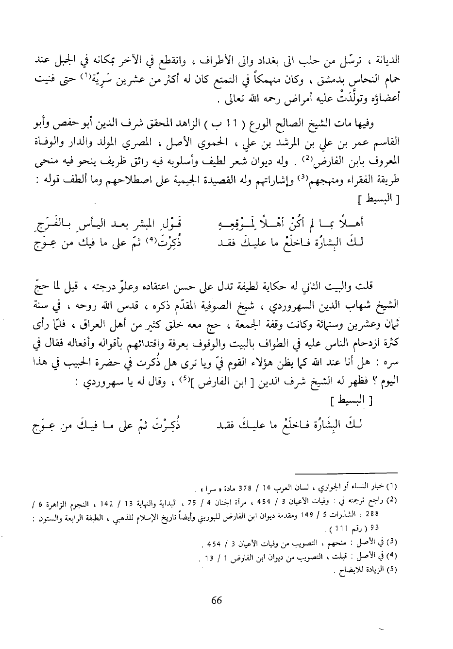 قلت والبيت الثاني له حكاية لطيفة تدل على حسن اعتقاده وعلوّ درجته، قيل لما حجّ الشيخ شهاب الدين السهروردي، شيخ الصوفية المقدّم ذكره، قدس الله روحه، في سنة ثمان وعشرين وستمائة وكانت وقفة الجمعة، حج معه خلق كثير من أهل العراق، فلمّا رأى كثرة ازدحام الناس عليه في الطواف بالبيت والوقوف بعرفة واقتدائهم بأقواله وأفعاله فقال في سره: هل أنا عند الله كما يظن هؤلاء القوم فيّ ويا ترى هل ذكرت في حضرة الحبيب في هذا اليوم؟ فظهر له الشيخ شرف الدين [ابن الفارض] (¬5)، وقال له يا سهروردي: