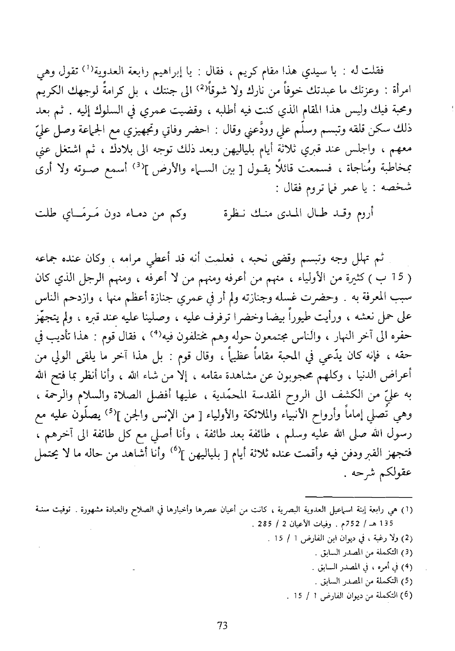 فقلت له: يا سيدي هذا مقام كريم، فقال: يا إبراهيم رابعة العدوية (¬1) تقول وهي امرأة: وعزتك ما عبدتك خوفا من نارك ولا شوقا (¬2) الى جنتك، بل كرامة لوجهك الكريم ومحبة فيك وليس هذا المقام الذي كنت فيه أطلبه، وقضيت عمري في السلوك إليه. ثم بعد ذلك سكن قلقه وتبسم وسلّم علي وودّعني وقال: احضر وفاتي وتجهيزي مع الجماعة وصل عليّ معهم، واجلس عند قبري ثلاثة أيام بلياليهن وبعد ذلك توجه الى بلادك، ثم اشتغل عني بمخاطبة ومناجاة، فسمعت قائلا يقول [بين السماء والأرض] (¬3) أسمع صوته ولا أرى شخصه: يا عمر فما تروم فقال: