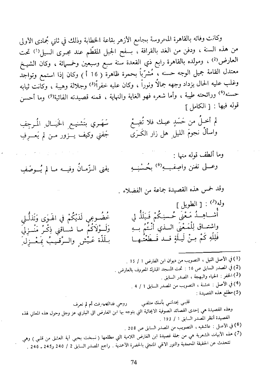 (¬5) مطلع هذه القصيدة: قلبى يحدثني بأنك متلفي روحي فداك عرفت أم لم تعرف وهذه القصيدة هي إحدى القصائد الصوفية الايحائية التي يتوجه بها ابن الفارض الى الباري عز وجل وحول هذه المعاني لهذه القصيدة أنظر المصدر السابق 1/ 193.