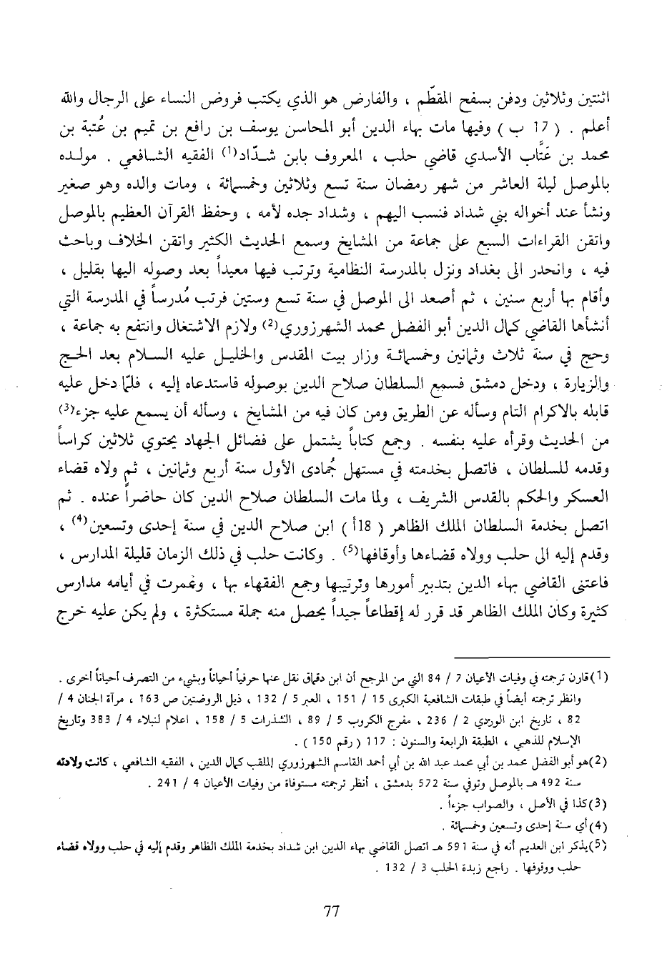 (¬5) يذكر ابن العديم أنه في سنة 591 هـ اتصل القاضي بهاء الدين ابن شداد بخدمة الملك الظاهر وقدم إليه في حلب وولاه قضاء حلب ووقوفها. راجع زبدة الحلب 3/ 132.