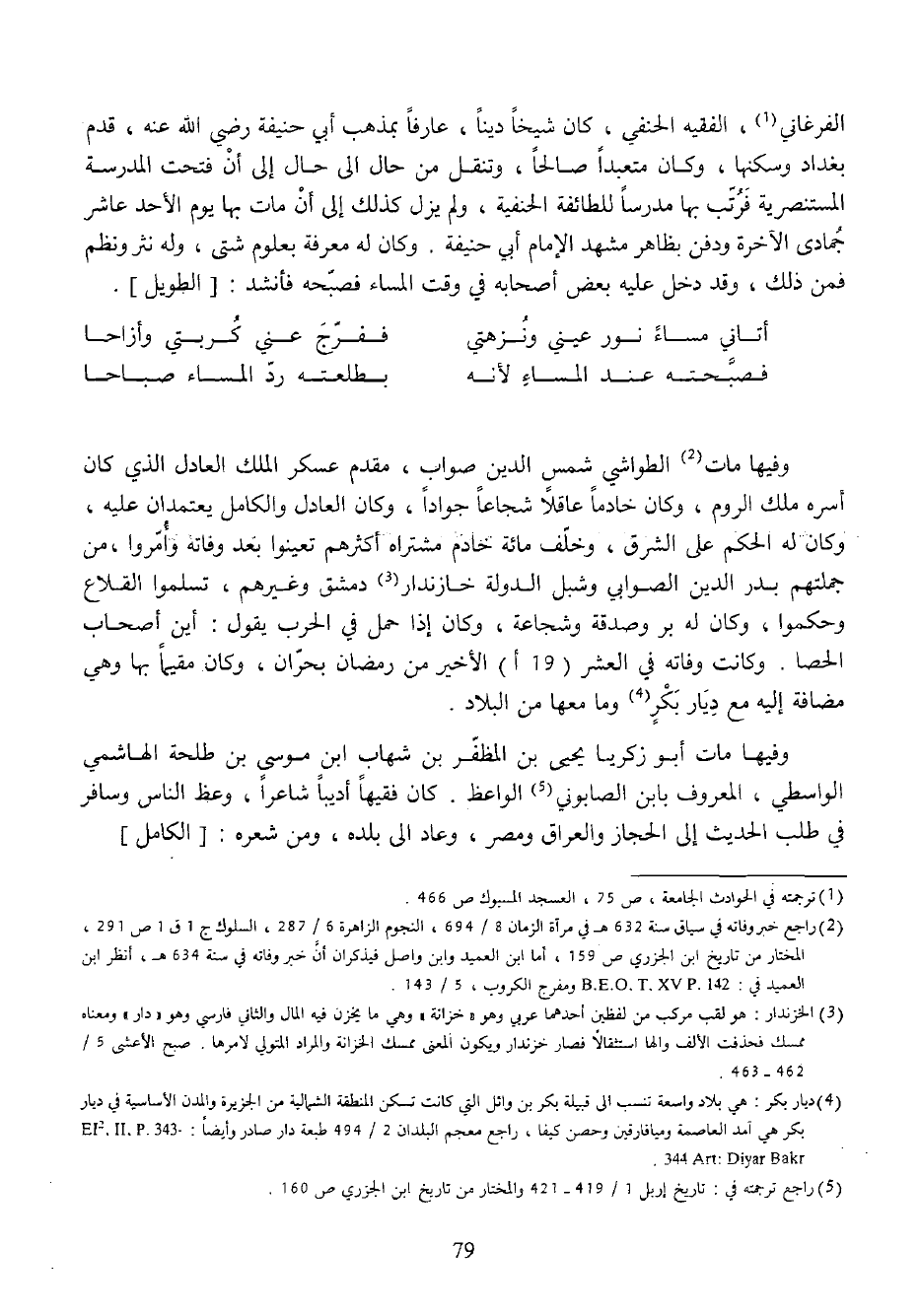 (¬2) راجع خبر وفاته في سياق سنة 632 هـ في مرآة الزمان 8/ 694، النجوم الزاهرة 6/ 287، السلوك ج 1 ق 1 ص 291، المختار من تاريخ ابن الجزري ص 159، أما ابن العميد وابن واصل فيذكران أنّ خبر وفاته في سنة 634 هـ، أنظر ابن العميد في: