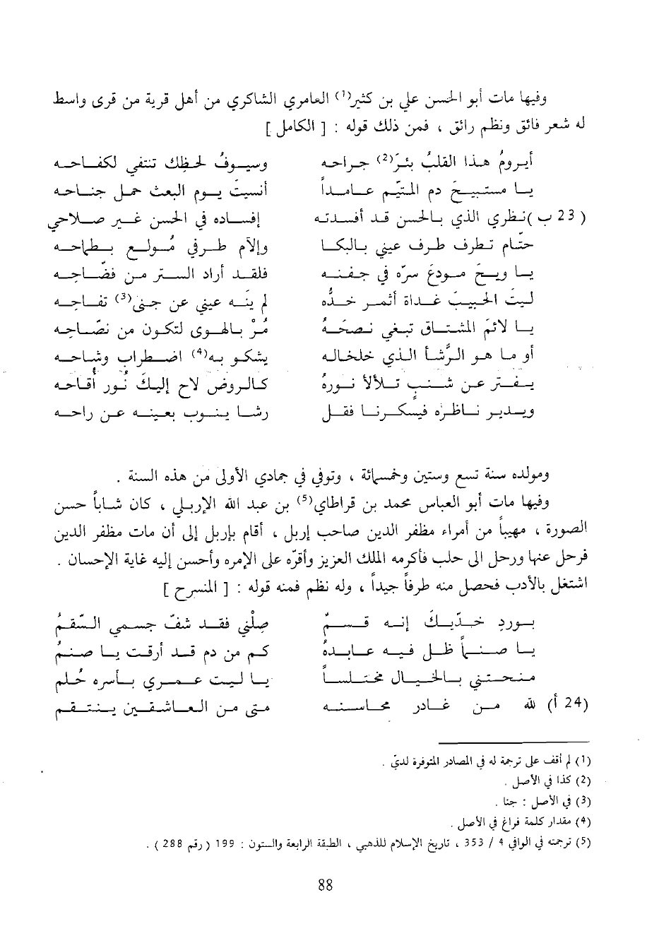 وفيها مات أبو الحسن علي بن كثير (¬1) العامري الشاكري من أهل قرية من قرى واسط له شعر فائق ونظم رائق، فمن ذلك قوله: [الكامل]