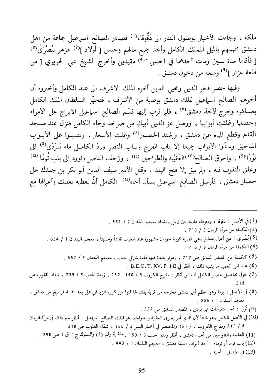 (¬7) حول تفاصيل حصار الكامل لدمشق أنظر: مفرج الكروب 5/ 150 - 152، زبدة الحلب 3/ 235، شفاء القلوب ص 318.