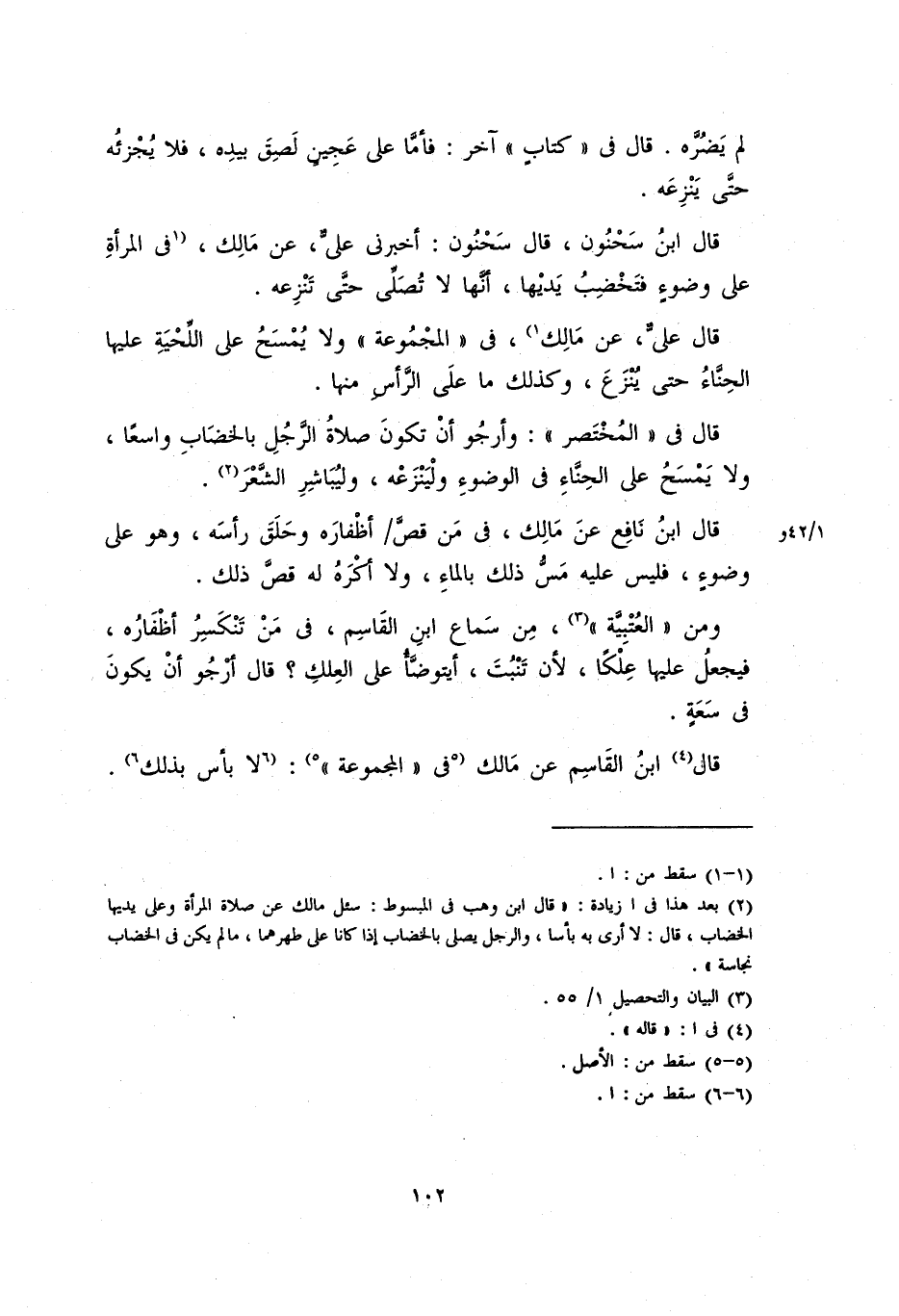 ومن الْعُتْبِيَّة، من سماع ابن القاسم، في مَنْ تنكسر أظفاره، فيجعل عليها عِلْكًا، لأنْ تَنْبُتَ، أيَتَوَضَّأُ على العِلكِ؟ قال: أرجو أن يكون في سَعَة.