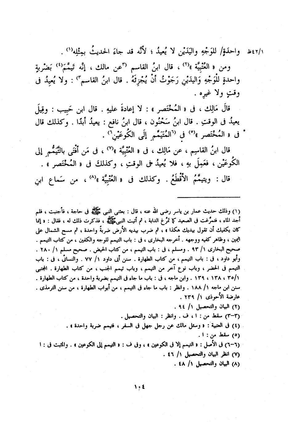 قال ابن القاسم، عن مالك، في الْعُتْبِيَّة، في مَنْ أفتى بِالتَّيَمُّمِ إلى الكُوعَيْنِ، فعَمِلَ به، فلا يُعِيدُ في الْوَقْتِ، وكذلك في المختصر.