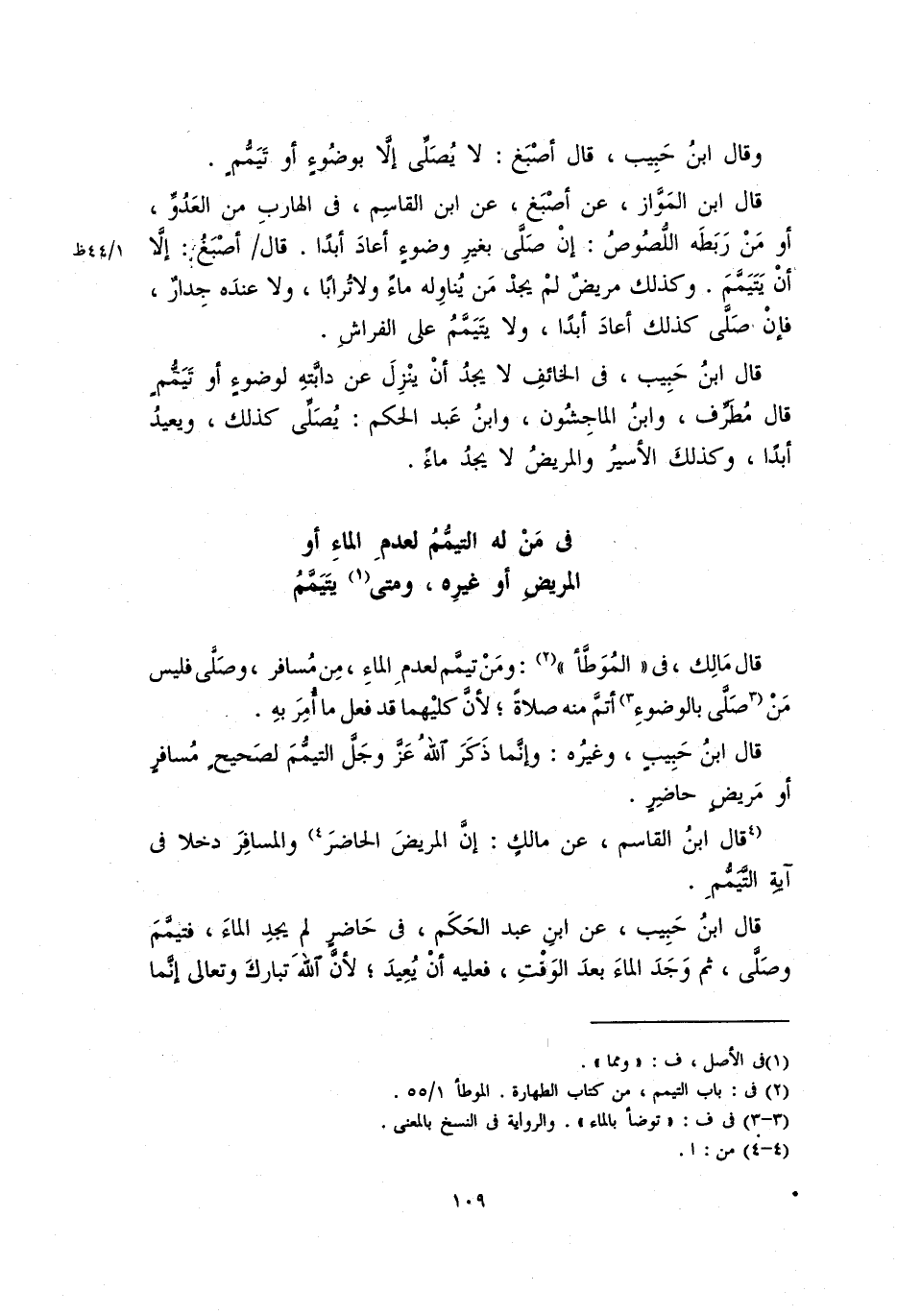 وقَالَ ابْنُ حَبِيبٍ: قال أَصْبَغُ: لا يُصَلِّي إلاَّ بوضوء أو تَيَمُّمٍ.