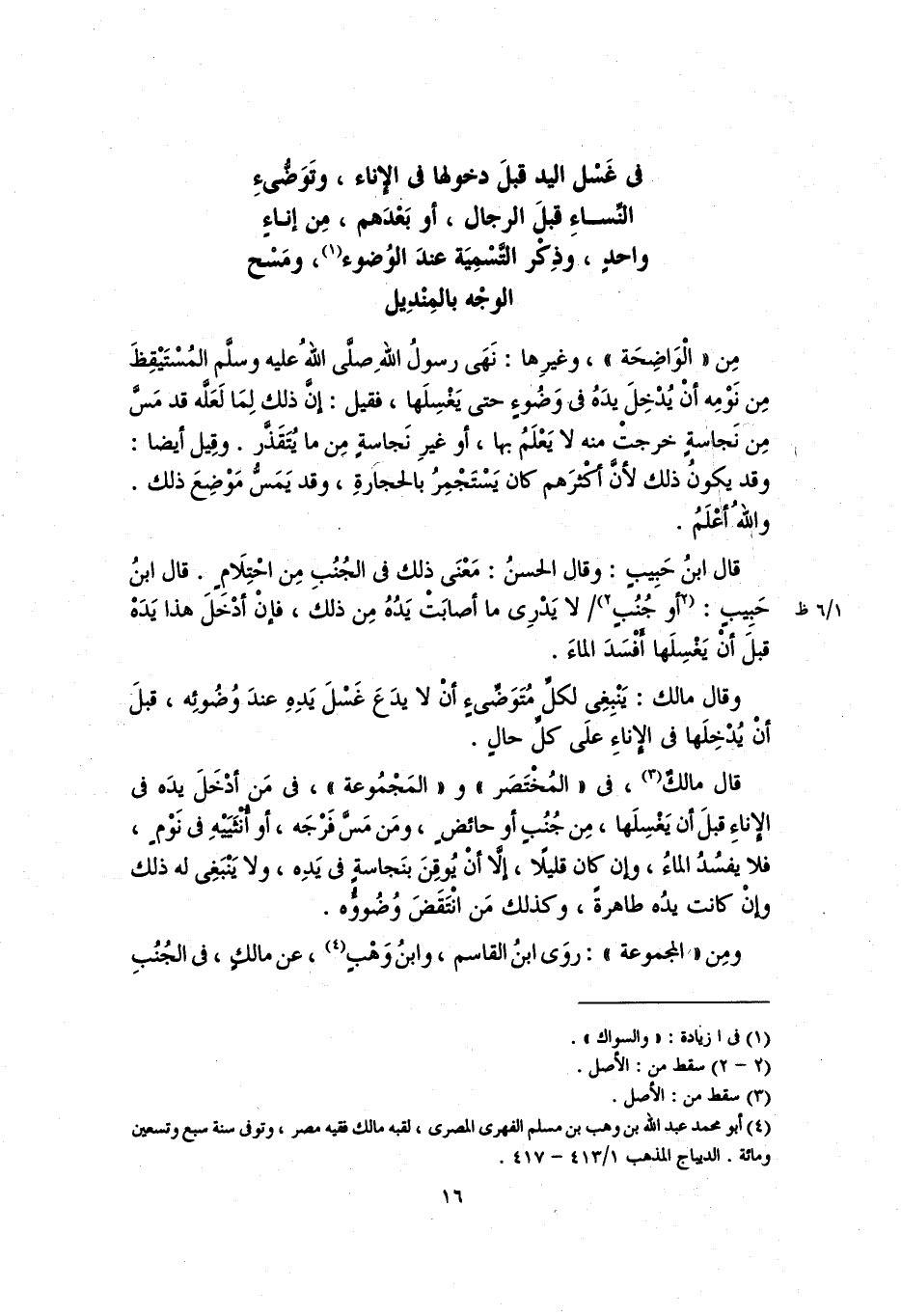 قال مالك في المختصر والمَجْمُوعَة، فِي مَنْ أدخل يده في الإناء قبل أَنْ يغسلها، من جُنُب أو حائض، ومن مسَّ فرجه، أو أنثييه في نوم، فلا يفسد الماء، وإن كان قليلاً، إلاَّ أَنْ يُوقن بنجاسة في يده، ولا ينبغي له ذلك وإن كانت يده طاهرة، وكذلك مَن انْتَقَضَ وُضوؤه.