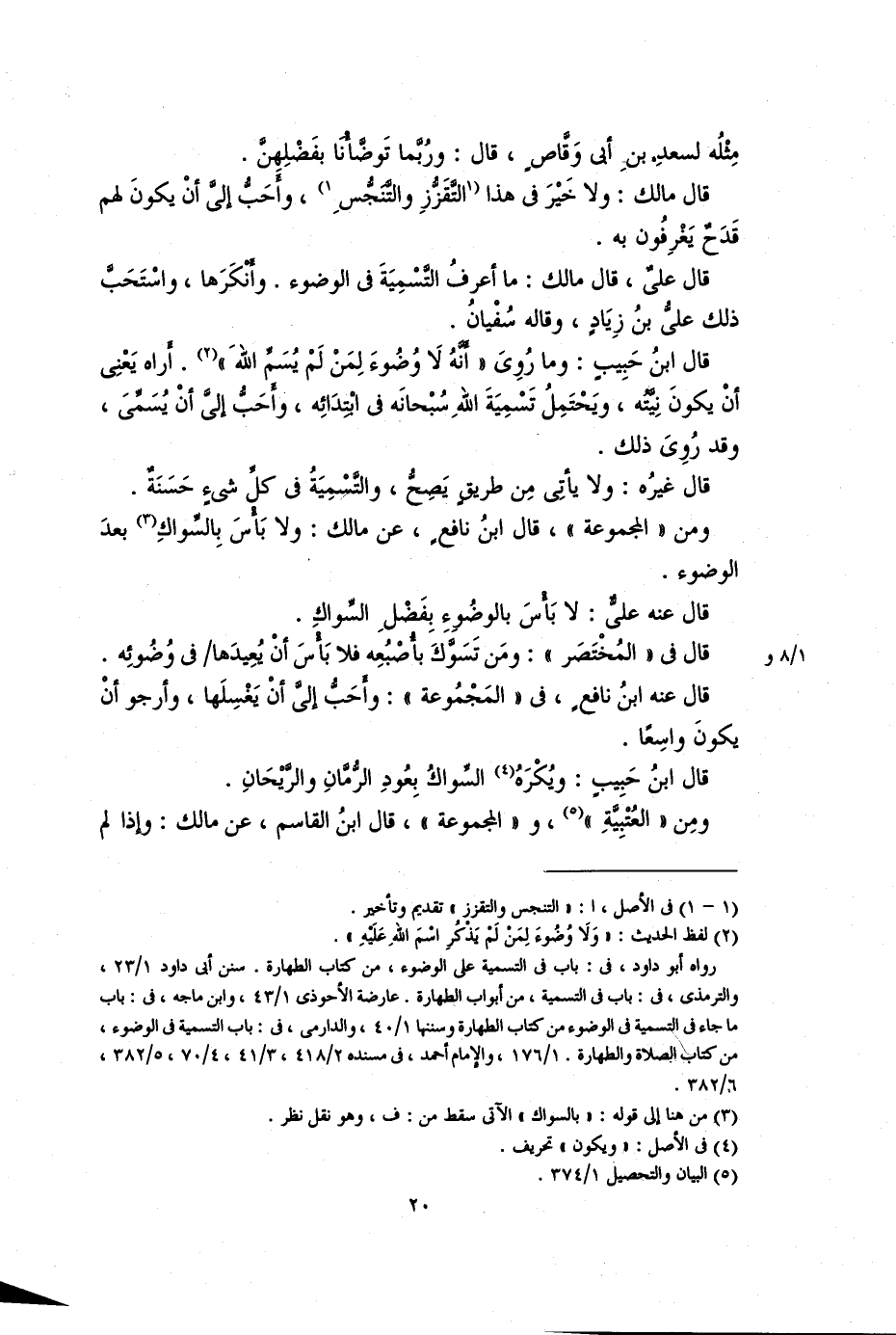 قال ابن حبيب: وما روي: «أنه لا وُضُوءَ لِمَنْ لَمْ يُسَمِّ اللهَ». أراه يعني أَنْ يكون نيَّتُه، ويحتمل تسمية الله سبحانه في ابتدائه، وأَحَبُّ إليَّ أَنْ يسمِّي، وقد روي ذلك.