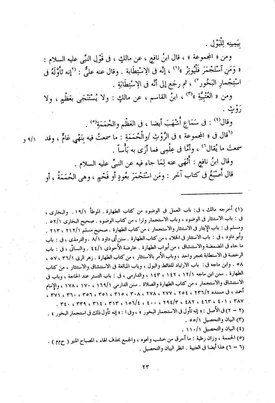 ومن المَجْمُوعَة قال ابن نافع عن مالك، في قول النبي عليه السلام: «وَمَنِ اسْتَجْمَرَ فَلْيُوتِرْ». إنه في الاستطابة. وقال عنه عليٌّ: إنه تأوَّله في استجمار البخور، ثم رجع إلى أنَّه في الاستطابة.