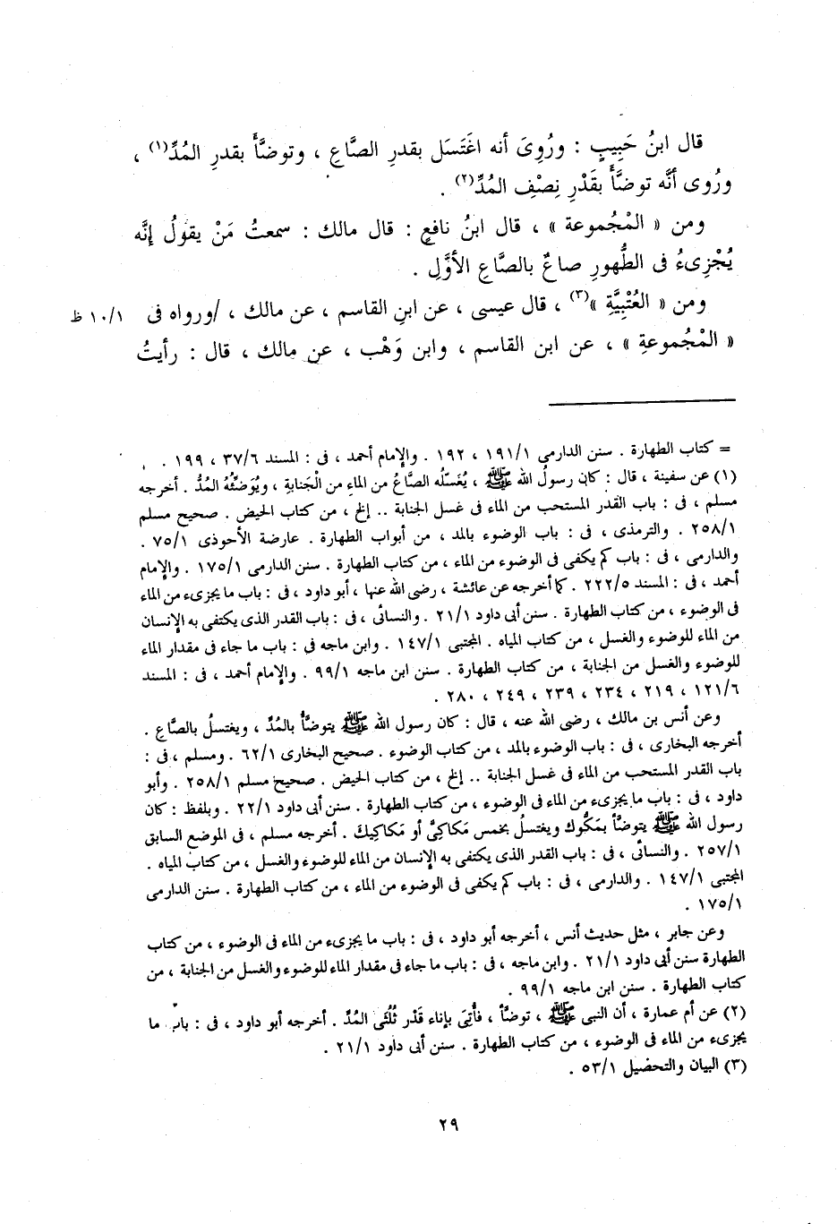 قال ابن حبيب: وروي أنَّه اغتسل بقد الصاع، وتوضَّأ بقدر المُدِّ، وروي أنَّه توضَّأ بقدر نصف المُدِّ.