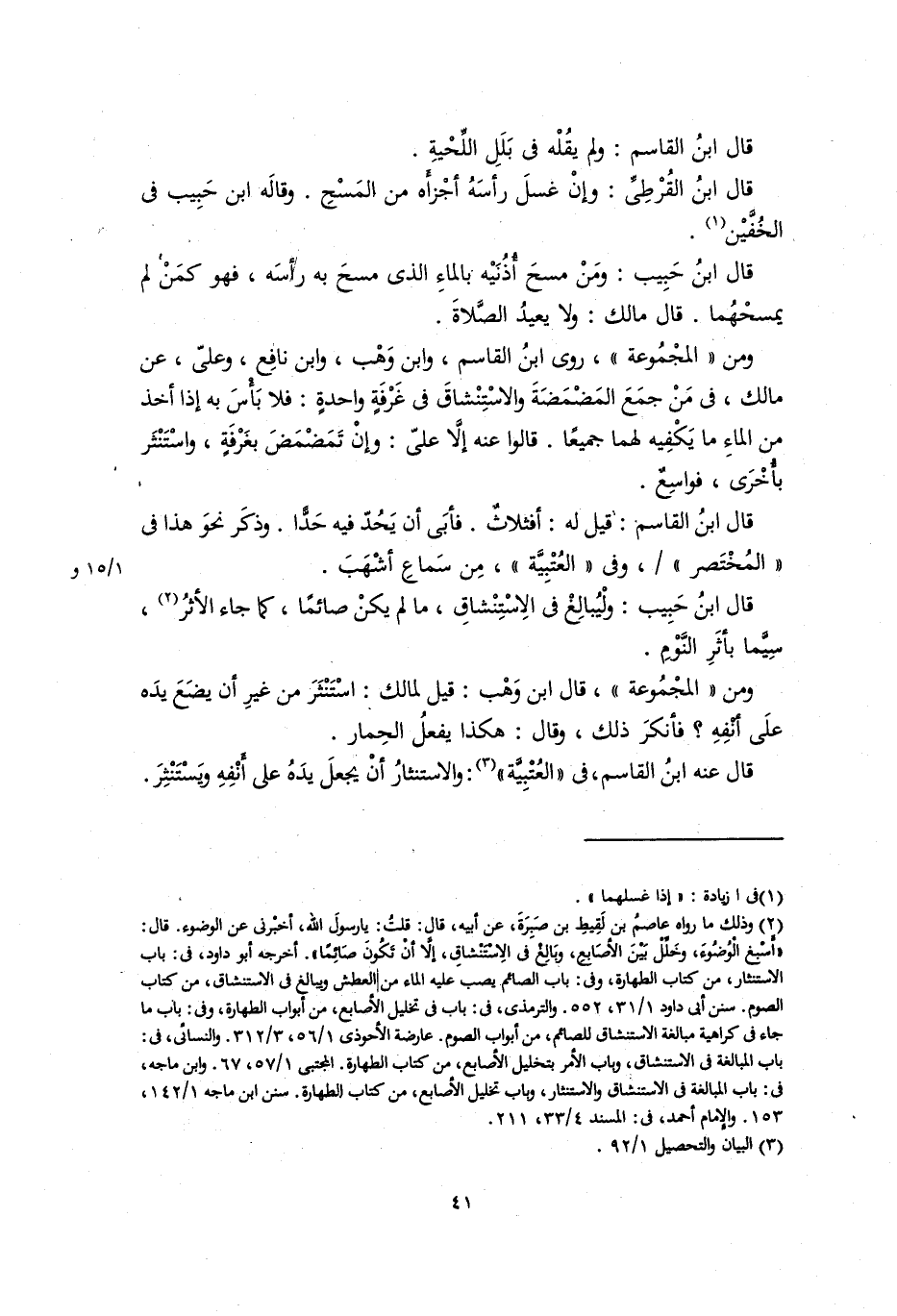 قال عنه ابن القاسم في الْعُتْبِيَّة: والاستنثار أَنْ يجعلَ يده على أنفه ويستنثر.