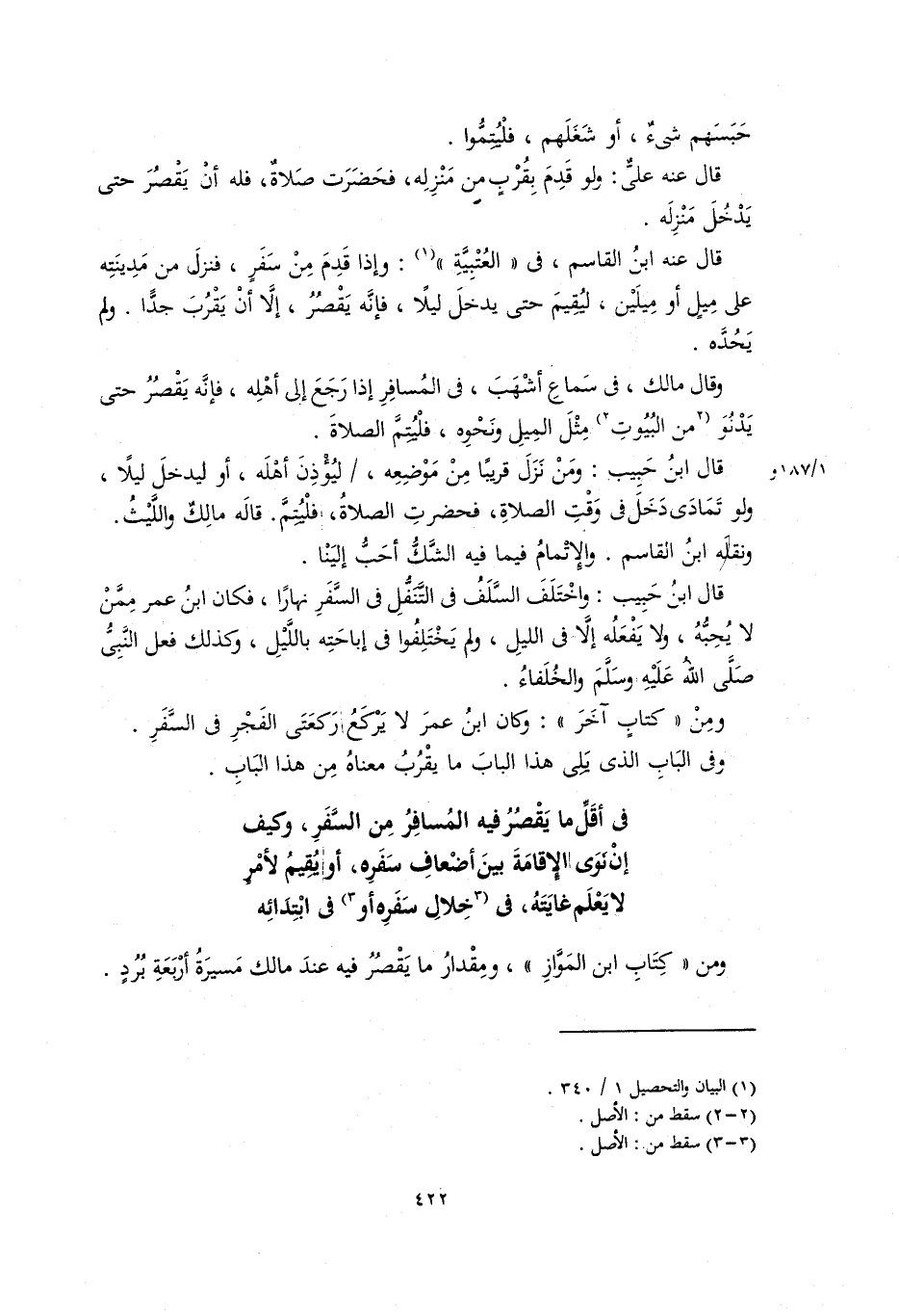قال عنه ابن القاسم، في الْعُتْبِيَّة: وإذا قدم من سفر، فنزل من مدينته على ميل أو ميلين؛ ليُقيم حَتَّى يدخل ليلاً، فإنه يَقْصُرُ، إلاَّ أن يَقْرُبَ جدًّا. ولم يَحُدَّه.