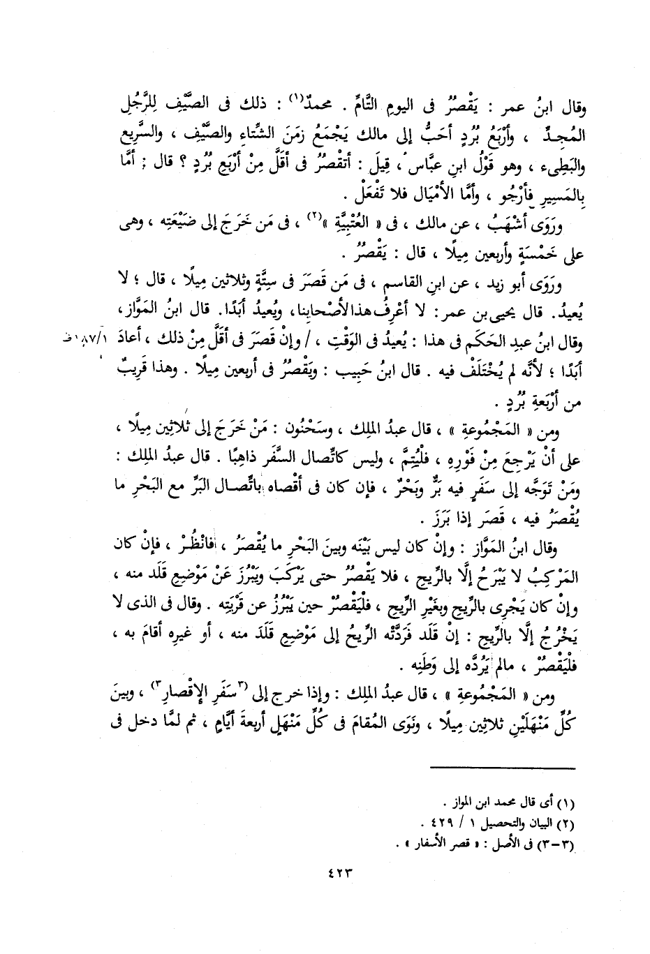 ومن المجموعة، قال عبد الملك وسَحْنُون: مَنْ خرج إلى ثلاثين ميلاً، على أن يرجع من فَوْرِهِ، فَلْيُتِمَّ، وليس كاتِّصال السفر ذاهبًا. قال عبد الملك: ومن توجَّه إلى سفر فيه برٌّ وبحرٌ، فإن كان في أقْصاه باتِّصال البَرِّ مع البحرِ ما يُقْصَرُ فيه، قصر إذا بَرَزَ.