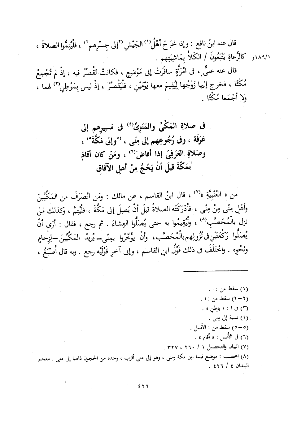 من الْعُتْبِيَّة، قَالَ ابْنُ الْقَاسِمِ، عن مالك: ومن انصرف من المكيين وأهل منى من منى، فأدركته الصلاة قبل أن يَصِلَ إلى مكة، فليُتِمَّ، وكذلك من نزل بالمُحَصَّبِ، وليُقيمُوا به حَتَّى يُصَلُّوا العشاء. ثم رجع، فقال: أرى أن يُصَلُّوا رَكْعَتَيْنِ في نزولهم بِالْمُحَصَّبِ، وأن يُؤَخِّرُوا بمنى – يريد المكيين – لزحام ونحوه. واختَلَفَ في ذلك قول ابن القاسم، وإلى آخر قوليه رجع. وبه قال أَصْبَغُ،