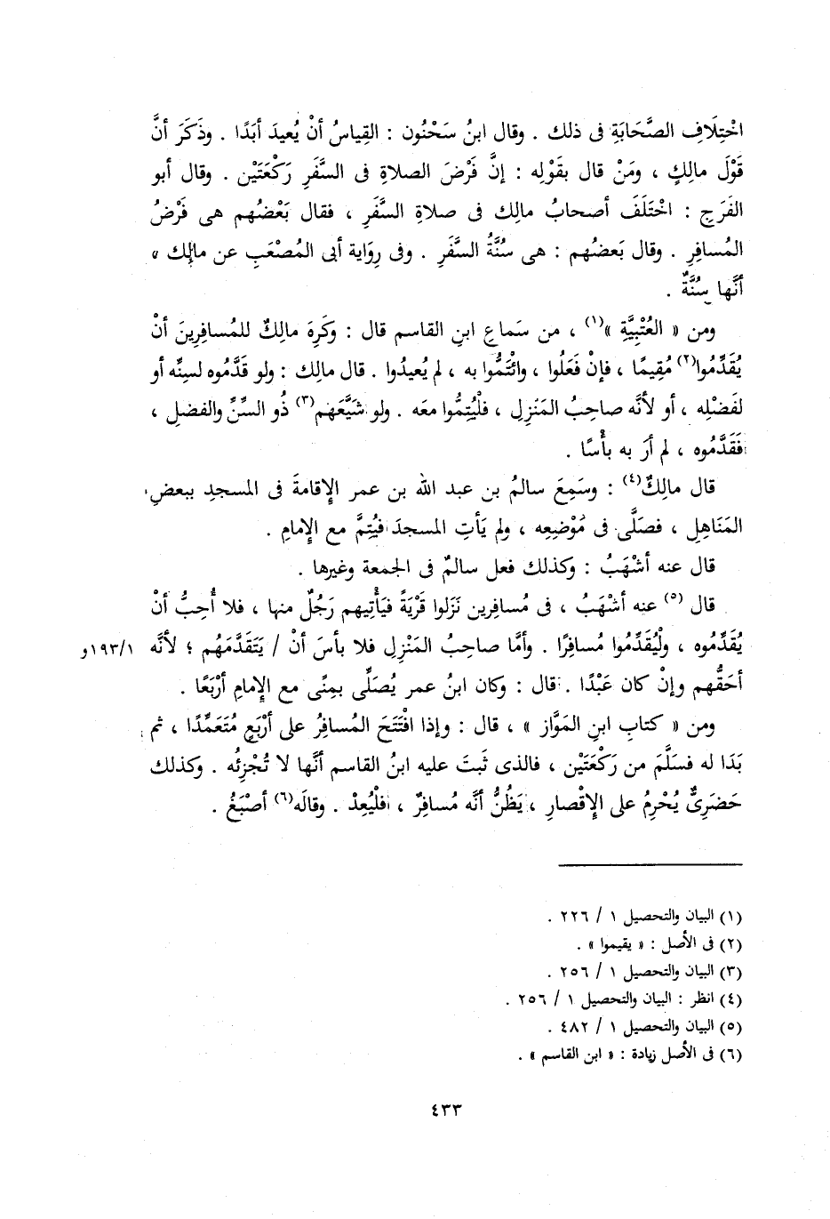 اختلاف الصحابة في ذلك. وقَالَ ابْنُ سَحْنُون: القياس أن يُعِيد أبدًا. وذَكَرَ أنَّ قولَ مالكٍ، ومَنْ قال بِقَوْلِهِ: إنَّ فَرْضَ الصلاة في السفر رَكْعَتَيْنِ. وقال أبو الفرج: اختلف أصحاب مالك في صلاة السفر، فقال بعضهم: هي فَرْضُ المسافر. وقال بعضهم: هي سُنَّةُ السفرِ. وفي رِوَايَة أبي المصعب عن مالك أنها سُنَّةٌ.