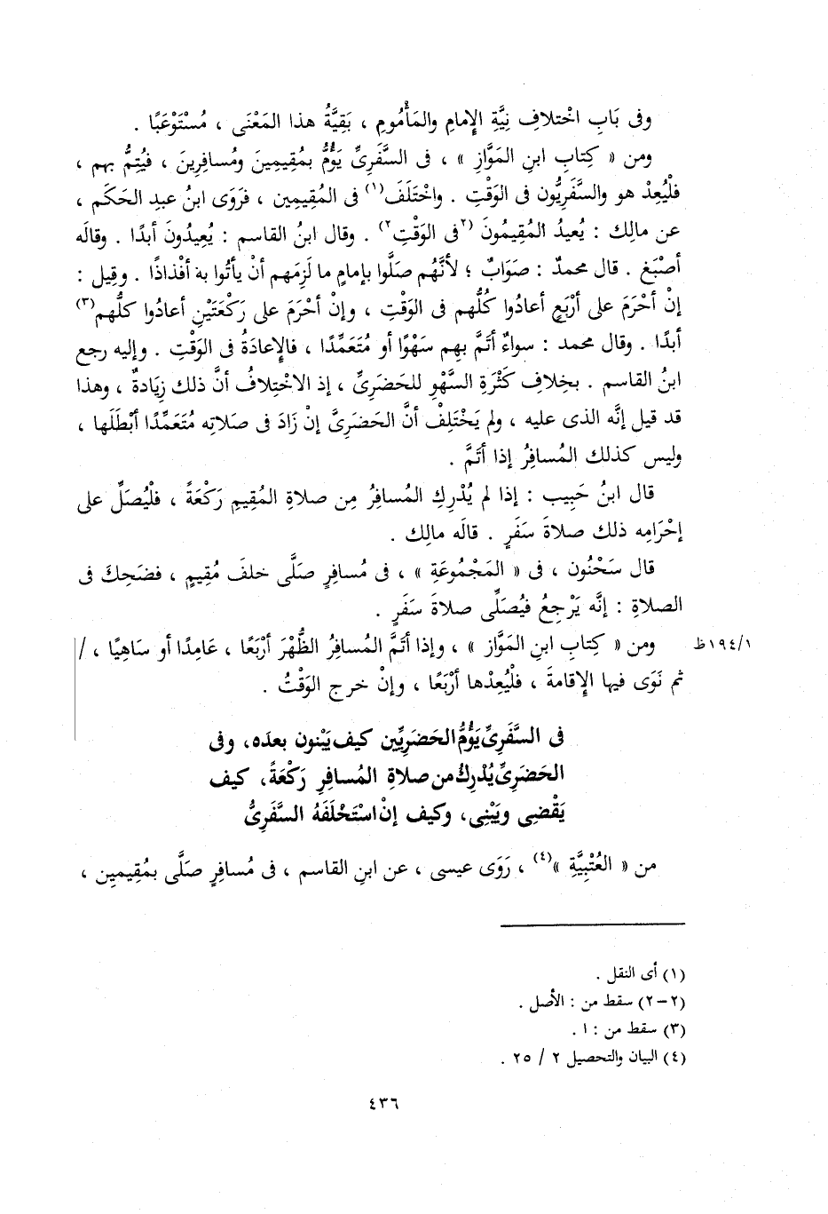 من الْعُتْبِيَّة، رَوَى عيسى، عَنِ ابْنِ الْقَاسِمِ، في مسافر صَلَّى بمقيمين،