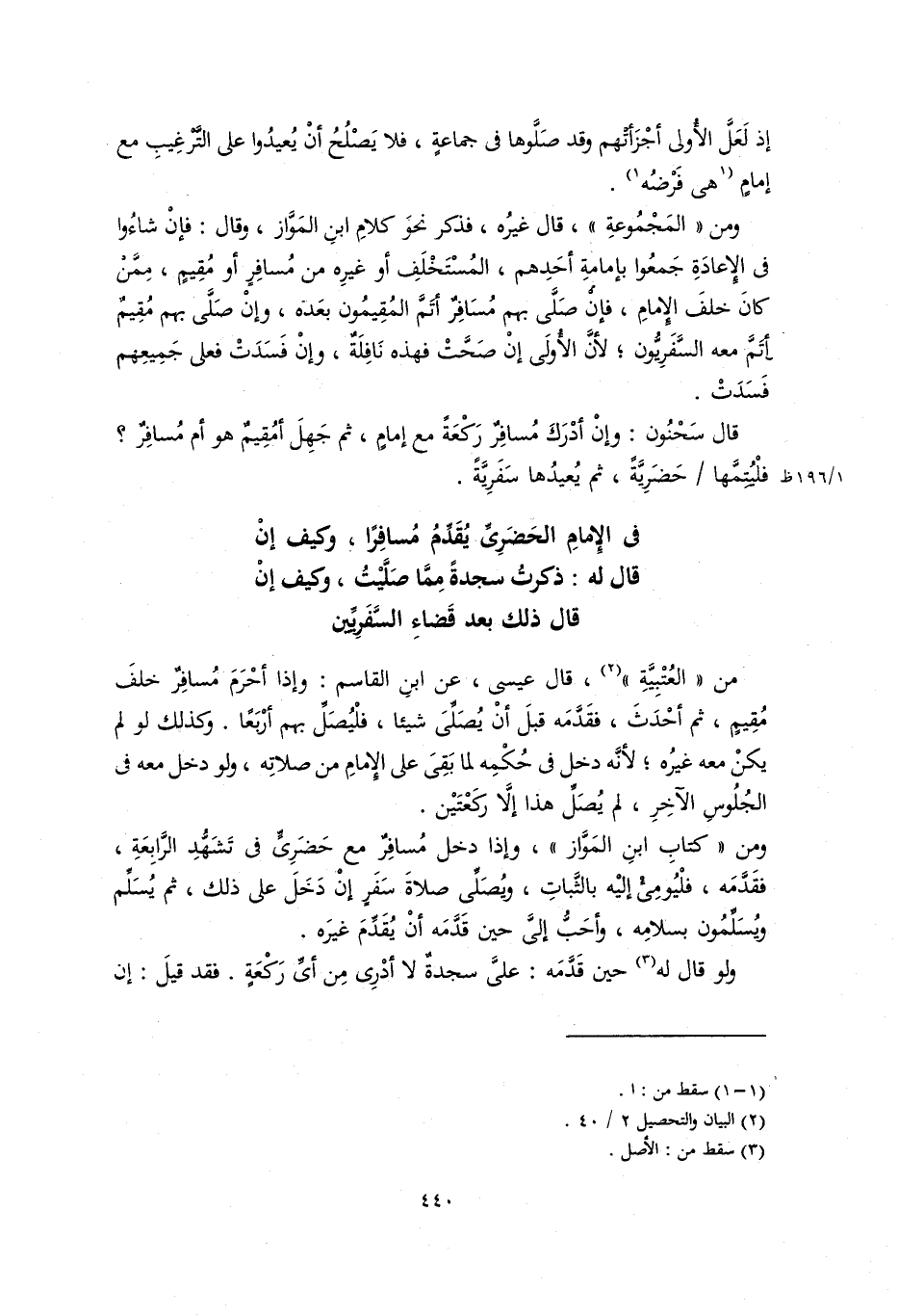 من الْعُتْبِيَّة، قال عيسى، عَنِ ابْنِ الْقَاسِمِ: وإذا أحرم مسافرٌ خلف مقيم، ثم أحدثَ، فقدَّمه قبل أن يُصَلِّيَ شَيْئًا، فَلْيُصَلِّ بهم أربعًا. وكذلك لو لم يكن معه غيره؛ لأنه دخل في حُكْمِه لما بَقِيَ على الإمام من صلاته، ولو دخل معه في الجلوس الآخِرِ، لم يُصَلِّ هذا إلاَّ رَكْعَتَيْنِ.