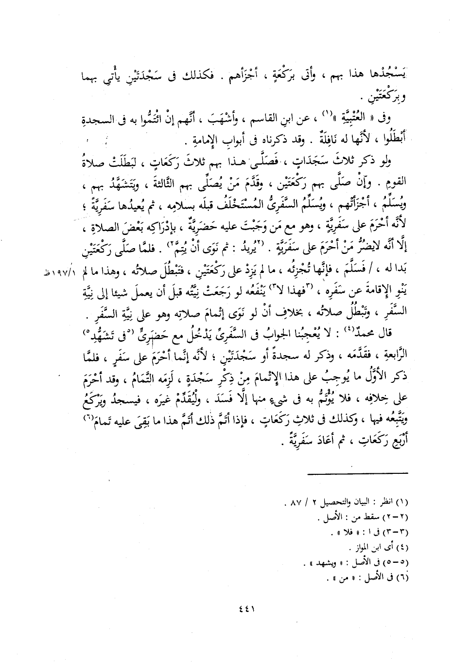 قال محمد: لا يُعْجِبُنا الجواب في السفري يدخل مع حضري في تَشَهُّد الرابعة، فقدَّمَه، وذكر له سجدة أو سجدتين؛ لأنه إِنَّمَا أحْرم على سفر، فلما ذكر الأول ما يُوجب على هذا الإتمام من ذِكْرِ سجدة، لزمه التمام، وقد أحْرم على خلافه، فلا يُؤْتمُّ به في شيء منها إلاَّ فسدن وليُقَدِّمْ غيره، فيسجدُ ويركعُ ويتَّبِعُه فيها، وكذلك في ثلاث ركعات، فإذا أتمَّ ذلك أتمَّ هذا ما بَقِيَ عليه تمام أربع ركعات، ثم أعاد سفرية.