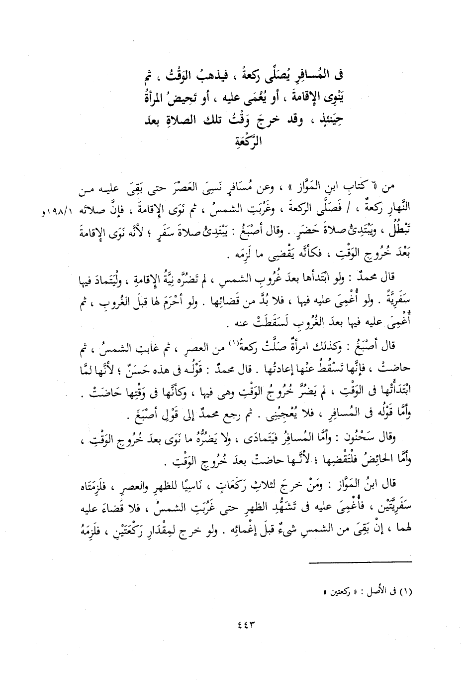 قال أَصْبَغُ: وكذلك امرأة صَلَّت ركعة من لعصر، ثم غابت الشمس، ثم حاضتْ، فإنها تسقط عنها إعادتها. قال محمد: قوله في هذه حسنٌ؛ لأنها لما ابتدأتها في الْوَقْتِ، لم يضُرَّ خروج الوقت وهي فيها، وكأنها في وقتها حاضتْ. وأما قوله في المسافر فلا يُعْجِبُنِي. ثم رجع محمد إلى قول أصبغ.