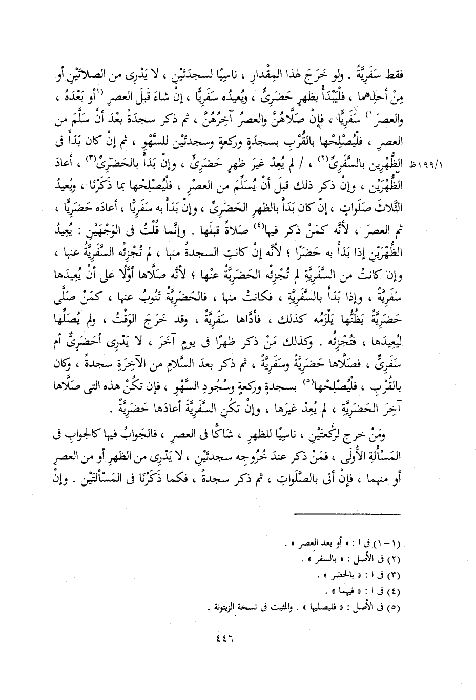 فقط سفرية. ولو خرج لهذا المقدار، ناسيًا لسجدتين، لا يدري من الصلاتين أو من أحدهما، فليبدأ بظهر حضريٍّ، ويعيده سفريًّا، إن شاء قبل العصر أو بعده، والعصر سفريًّا، فإن صلاهنَّ والعصر آخرهنَّ، ثم ذكر سجدة بعد أن سلَّمَ من العصر، فليُصلحهما بالقرب بسجدة وركعة وسجدتين للسهو، ثم إن كان بدأ في الظهرين بالسفري، لم يُعِدْ غير ظهر حضريٍّ، وإن بدأ بالحضريِّ، أعاد الظهرين، وإن ذكر ذلك قبل أن يسلمَ من العصر، فليصلحهما بما ذَكَرْنَا، ويُعِيد الثلاث صلوات، إن كان بدأ بالظهر الحضريِّ، وإن بدأ به سفريًّا، أعاد حضريًّا، ثم العصر؛ لأنه كمَنْ ذكر فيها صلاة قبلها. وإِنَّمَا قُلْتُ في الوجهين: يُعِيد الظهرين إذا بدأ به حضرًا؛ لأنه إن كانت السجدة منها، لم تُجْزِئُهُ السفرية عنها، وإن كانت من السفرية لم تُجْزِئُهُ الحضرية عنها؛ لأنه صلاها أَوَّلاً على أن يعيدها سفرية، وإذا بدأ بالسفرية، فكانت منها، فالحضرية تنوب عنها، كمن صَلَّى حضرية يظنُّها يلزمه كذلك، فأدَّاها سفرية، وقد خرج الوقت، ولم يُصَلِّها ليعيدها، فتجزئه. وكذلك مَنْ ذكر ظُهْرًا في يوم آخَرَ، لا يدري أحضريٌّ أم سفريٌّ، فصلاها حضرية وسفرية، ثم ذكر بعد السَّلام من الآخِرَة سجدة، وكان بالقرب، فليصلحها بسجدة وركعة وسُجُود السهو، فإن تكن هذه التي صلاها آخِرَ الحضرية، لم يُعِدْ غيرها، وإن تكن السفرية أعادها حضرية.