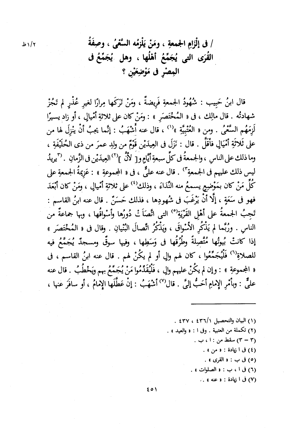 قَالَ ابْنُ حَبِيبٍ: شهود الجمعة فَرِيضَة ن ومن تركها مرارًا لغير عذر لم تجز شهادته. قال مالك في المختصر: ومن كان على ثلاثة أميال، أو زاد يسيرًا لزمهم السعي. ومن الْعُتْبِيَّة، قال عنه أشهب: إِنَّمَا يجب أن ينزل لها من على ثلاثة أميال فأقلَّ. قال: نزل في الْعِيدَيْنِ قوم من ولد عمرَ من ذي الحليفة، وما ذلك على الناس، والجمعة في كل سبعة أَيَّام ولأن الْعِيدَيْنِ في الزمان. يريد ليس ذلك عليهم في الجمعة. قال عنه عليٌّ، في المجموعة: عزيمة الجمعة على كل من كان بموضع يسمع منه النداء، وذلك على ثلاثة أميال ن ومن كان أبعد فهو في سعة، إلاَّ أن يرغب في شهودها، فذلك حسن. قال عنه ابن القاسم: تجب الجمعة على أهل القرية التي اتصلت دُورُها وأسواقها، وبها جماعة من الناس. وربما لم يَذكر الأسواق، ويذكر اتصال البنيان. وقال في المختصر: إذا كانت بيوتها متصلة وطرقها في وسطها، وفيها سوق ومسجد يُجَمَّع فيه للصلاة فليُجَمِّعوا، كان لهم والٍ أو لم يكن لهم. قال عنه ابن القاسم, في المجموعة: وإن لم يكن عليهم والٍ، فليقدموا من يُجَمِّع بهم ويخطب. قال عنه عليٌّ: وبأمر الإمام أَحَبُّ إِلَيَّ. قال أشهب: عن عطَّلها الإمام، أو سافر عنها،