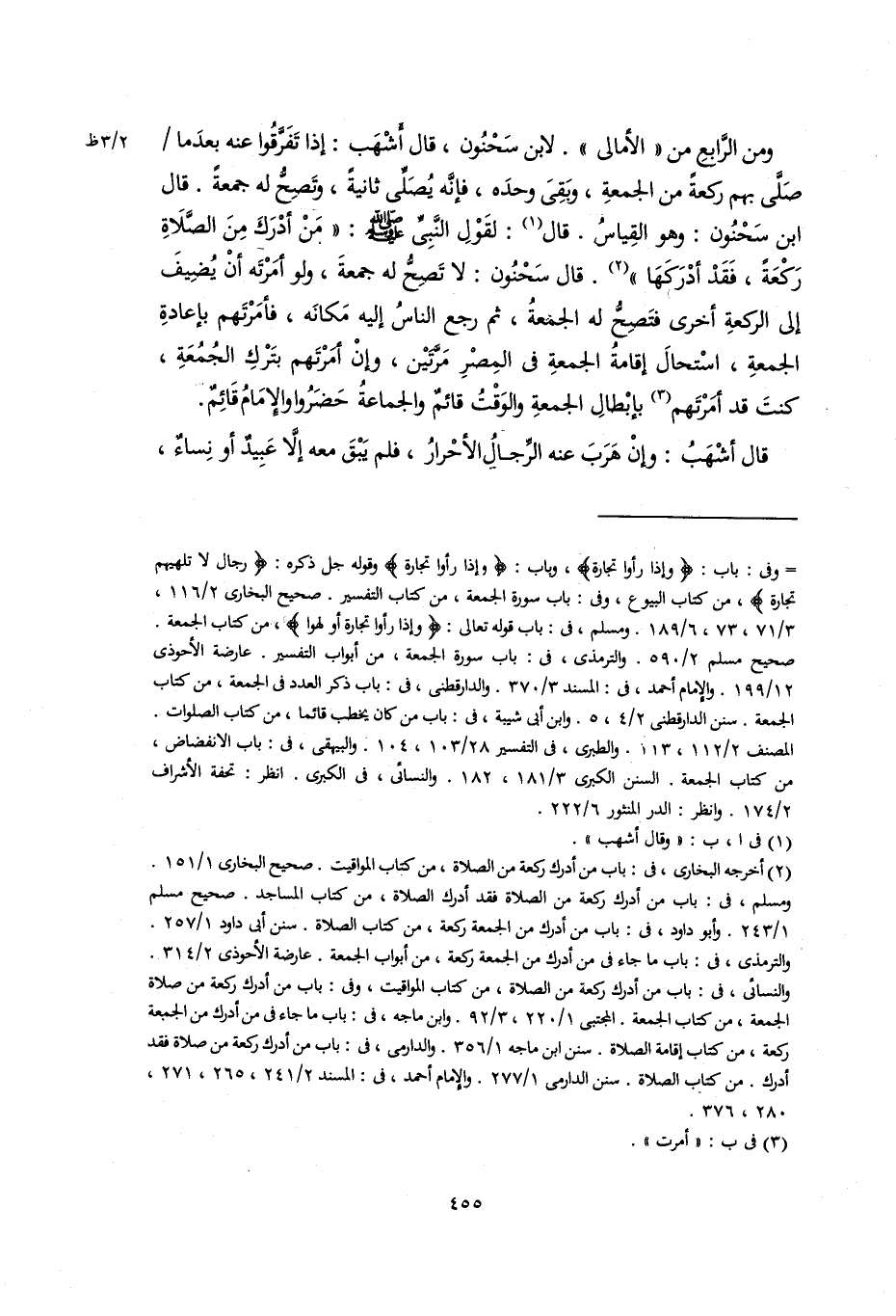 ومن الرابع من الأمالي لابن سَحْنُون، قال أشهب: إذا تفرقوا عنه بعدما صَلَّى بهم ركعة من الجمعة، وبَقِيَ وحده، فإنه يُصَلِّي ثانية، وتصبح له جمعة. قَالَ ابْنُ سَحْنُون: وهو القياس. قال: لقول النبي صَلَّى الله عليه وسلم: ((من أدرك من الصلاة ركعة، فقد أدركها)). قال سَحْنُون: لا تصح له جمعة، ولو أمرته أن يضيف إلى الركعة أخرى فتصح له الجمعة، ثم رجع الناس إليه مكانه، فأمرتهم بإعادة الجمعة، استحال إقامة الجمعة في المصر مرتين، وإن أمرتهم بترك الجمعة، كنت قد أمرتهم بإبطال الجمعة والوقت قائم والجماعة حضروا والإمام قائم.