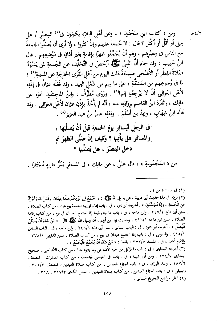 ومن (كتاب ابن سَحْنُون)، وعن أهل البلاء يكونون في المصر على ميل أو أقل أو أكثر؟ قال: لا جمعة عليهم وإن أكثروا، ولا أرى أن يصلوا الجمعة مع الناس في مصرهم، ولهم أن يجمعوا ظُهْرًا بإقامة بغير أذان في موضعهم. قَالَ ابْنُ حَبِيبٍ: وقد جاء أن النبي صَلَّى الله عليه وسلم أرخص في التخلف عن الجمعة لمن يشهد صلاة الفطر أو الأضحى صبيحة ذلك اليوم من أهل القرى الخارجة عن المدينة؛ لما في رجوعهم من المشقة، على ما بهم من شغل العيد، وقد فعله عثمان في إذنه لأهل العوالي أن لا يرجعوا إليها. ورَوَى مُطَرِّف، وابن المَاجِشُون نحوه عن مالك، وانفرد ابن القاسم بروايته عنه، أنه لم يأخذ بإذن عثمان لأهل العوالي. وقد قاله ابن شهاب، وزيد بن أسلم. وفعله عمر بن عبد العزيز.