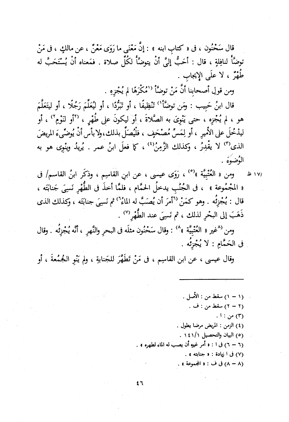 قال سحنون في كتاب ابنه: إن مَعْنَى ما رَوَى معنٌ، عن مالك، فِي مَنْ تَوَضَّأَ لنافلة، قال: أَحَبُّ إليَّ أَنْ يتَوَضَّأَ لكُلِّ صلاة. فمعناه أَنْ يُسْتَحَبَّ له طُهْر، لا على الإيجاب.