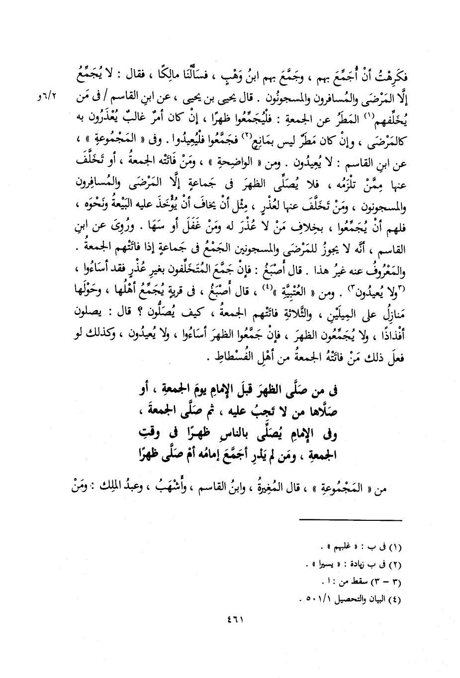 فكرهتُ أن أُجَمِّعَ بهم، وجمَّع بهم ابن وهب، فسألنا مالكًا، فقال: لا يُجمِّع إلاَّ المرضى والمسافرون والمسجونون. قال يحيى بن يحيى، عَنِ ابْنِ الْقَاسِمِ في مَنْ يُخَلِّفهم المطر عن الجمعة: فليُجَمِّعوا ظُهْرًا، إن كان أمرٌ غالب يُعْذَرون به كالمرضى، وإن كان مطرٌ ليس بمانع فجَمَّعوا فليعيدوا. وفي المجموعة عَنِ ابْنِ الْقَاسِمِ: لا يعيدون. ومن الواضحة، ومن فاتته الجمعة، أو تخلَّف عنها مِمَّنْ تلزمه فلا يُصَلِّي الظهر في جماعة إلاَّ المرضى والمسافرون والمسجونون، ومن تخلَّف عنها لعذر، مثل أن يخاف أن يُؤخذ عليه البيعة ونحوه، فلهم أن يُجَمِّعوا بخلاف من لا عذر له ومن غفل أو سها. ورُوِيَ عَنِ ابْنِ الْقَاسِمِ، أنه لا يجوز للمرضى والمسجونين الجمع في جماعة إذا فاتتهم الجمعة. والمعروف عنه غير هذا. قال أَصْبَغُ: فإن جَمَّع المتخلفون بغير عذر فقد أساءوا، ولا يعيدون. ومن الْعُتْبِيَّة، قال أَصْبَغُ، في قرية يُجَمِّع أهلها، وحولها منازل على الميلين، والثلاثة فاتتهم الجمعة، كيف يُصَلّون؟ قال: يصلون أفذاذًا، ولا يُجَمِّعون الظهر، فإن جمَّعوا الظهر أساءوا، ولا يعيدون، وكذلك لو فعل ذلك من فاتته الجمعة من أهل الفسطاط.